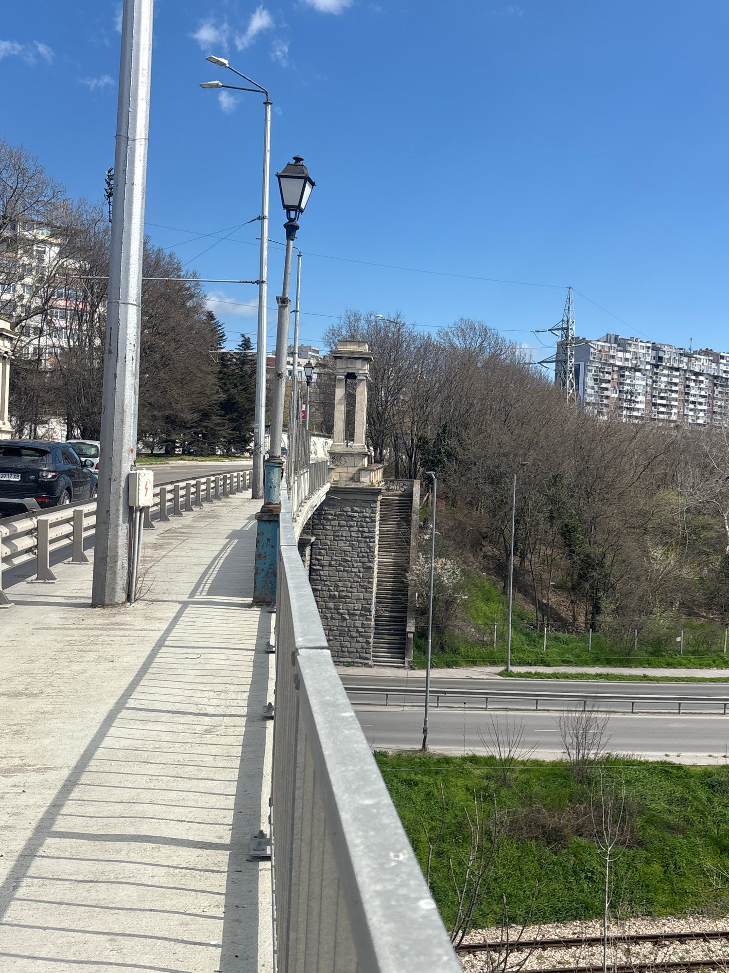 The image captures a perspective from a bridge in Varna, Bulgaria, looking towards an intersection with a set of stairs leading down to a lower level. The bridge features metal railings on the right s…read more