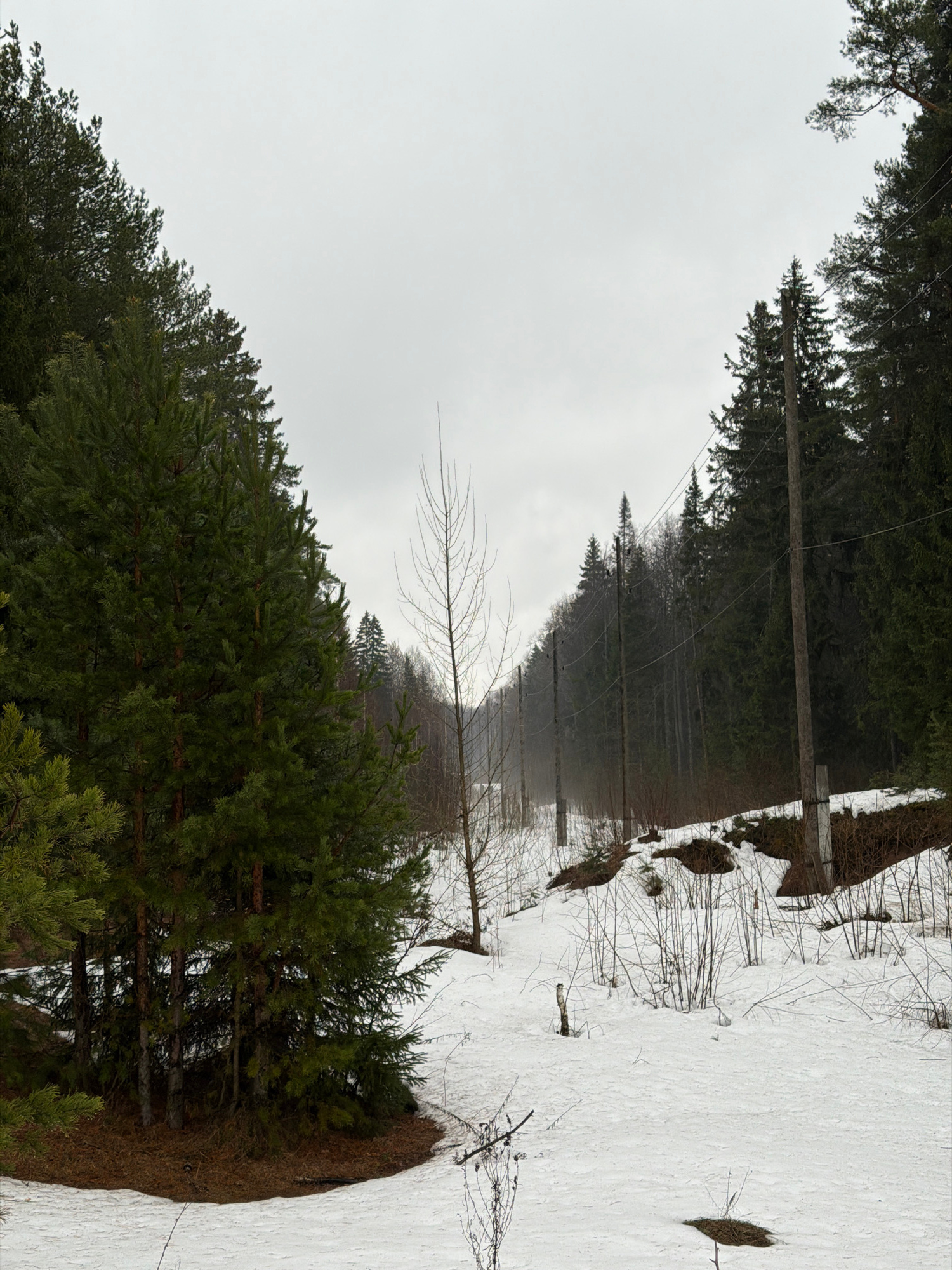 The image shows a forest scene in Chaikovsky, Russia during winter. Snow covers the ground, partially melted in some areas revealing brown vegetation. Evergreen trees dominate the landscape, with bareβ¦read more