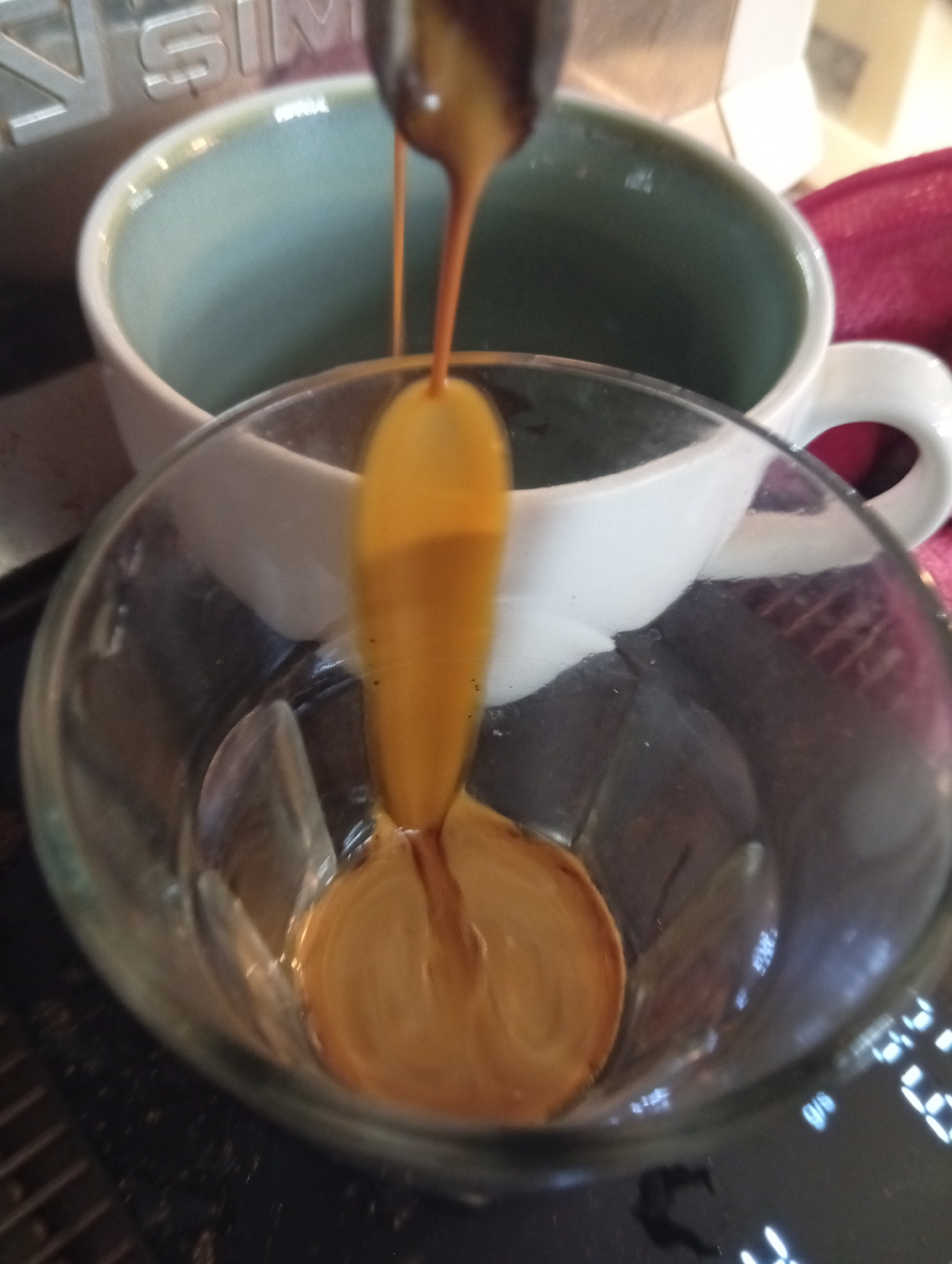A close-up shows a clear glass with a thick stream of amber liquid pouring into it. The liquid is pooling at the bottom, forming a circular pattern. Behind the glass is a light blue mug. A coffee mach…read more