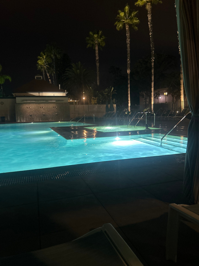 A serene night scene showcases a rectangular swimming pool bathed in a soft glow, likely from underwater lights. The pool's edge is bordered by a dark tiled surface, and lounge chairs are partially vi…read more