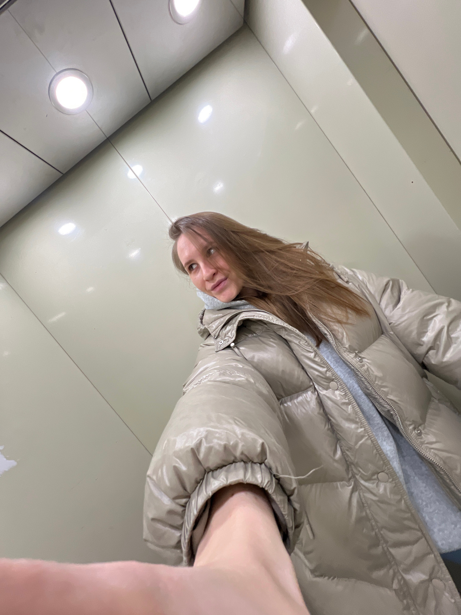 A woman with long brown hair is taking a selfie from a low angle in what appears to be an elevator. She is wearing a grey sweater underneath a beige puffer jacket. The elevator walls are beige and hav…read more