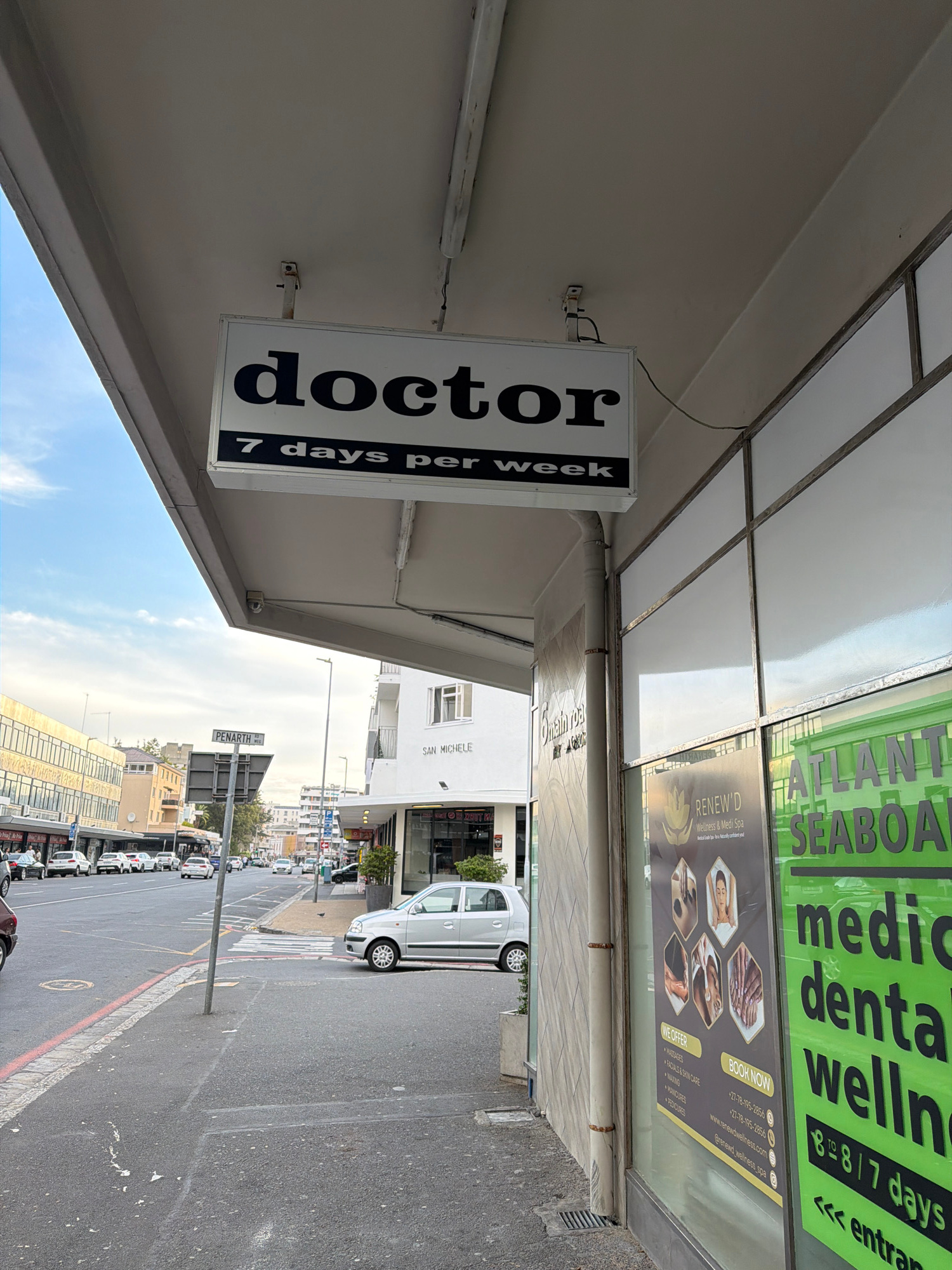 The image shows a street scene in Cape Town, South Africa. A sign for a "doctor" open "7 days per week" is visible under an awning. Next to it, another sign advertises "Atlantis Seaboard" for "medicalβ¦read more
