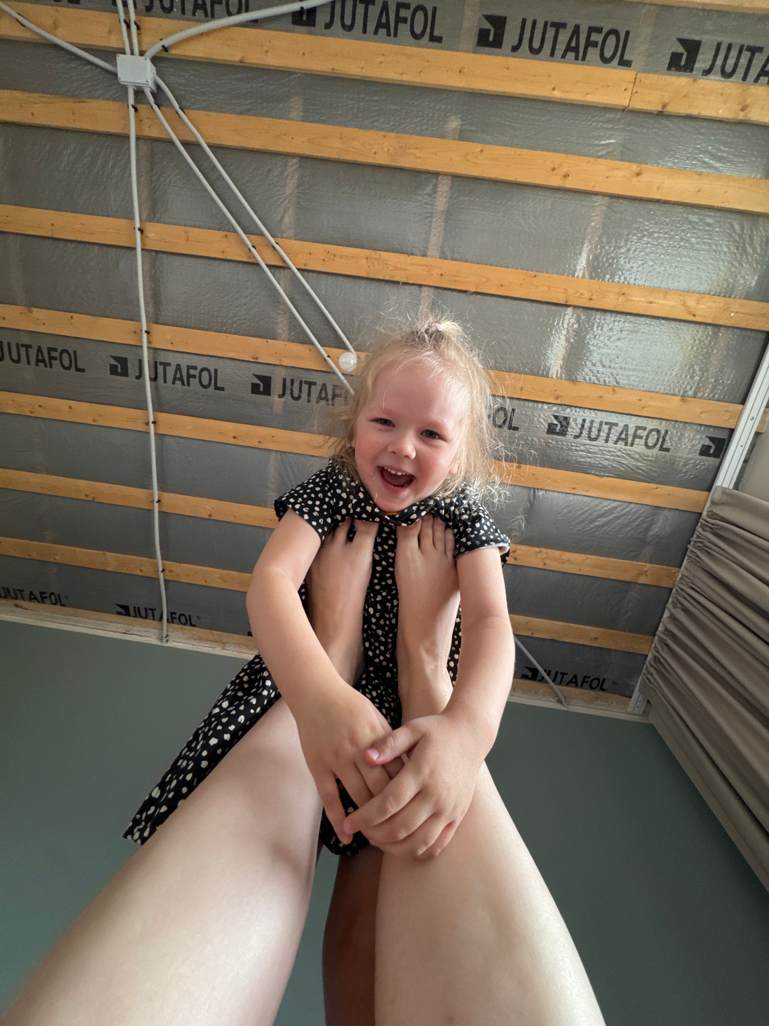A young child is being held upside down, laughing, with their feet near the head of the person holding them. The child is wearing a black and white polka dot dress. The background shows a ceiling with…read more