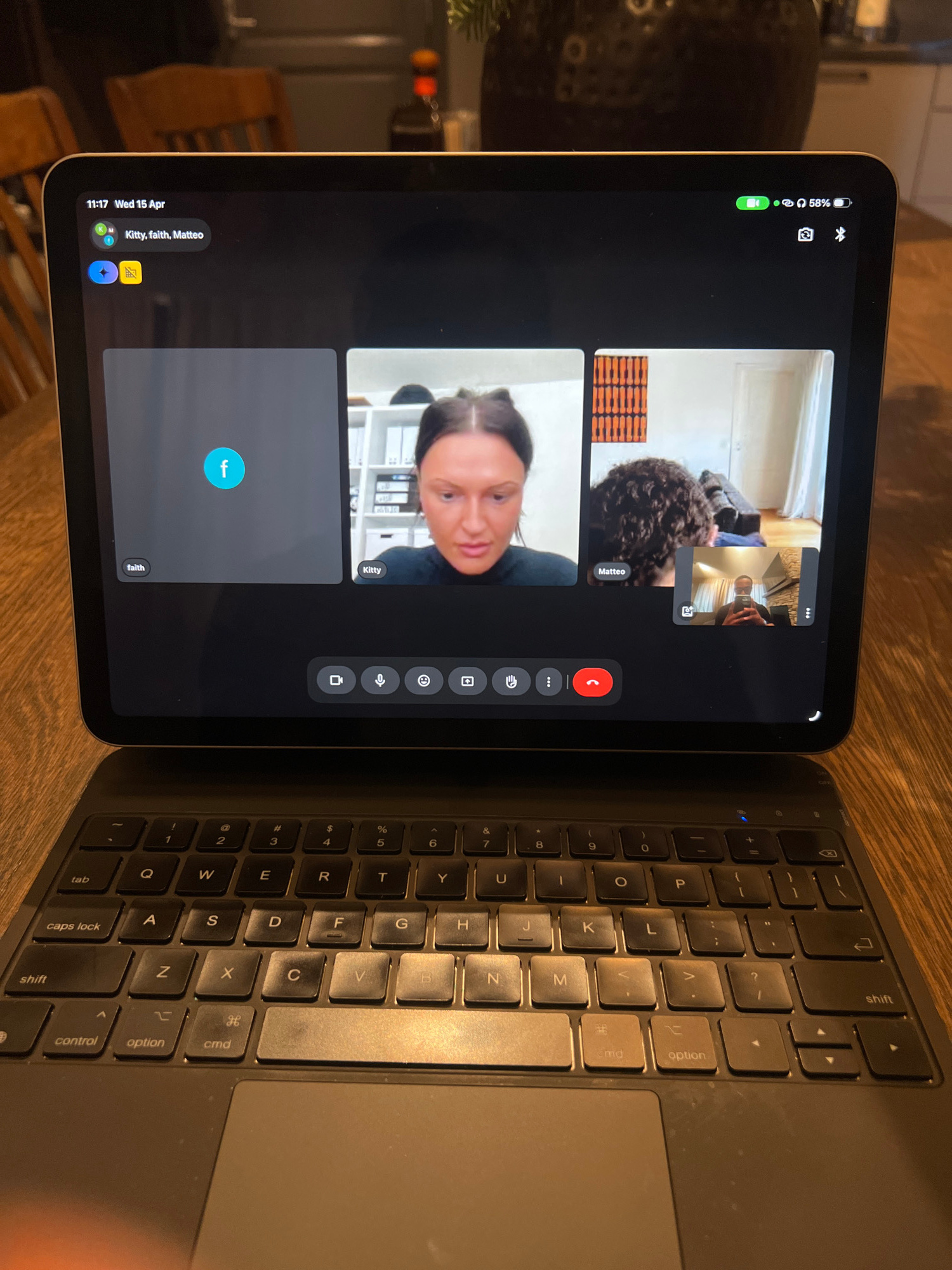 The image shows an iPad with a keyboard attached, displaying a Google Meet call. There are three participants visible on the screen: "Matteo", "Kitty", and "faith". "faith's" camera is not currently a…read more