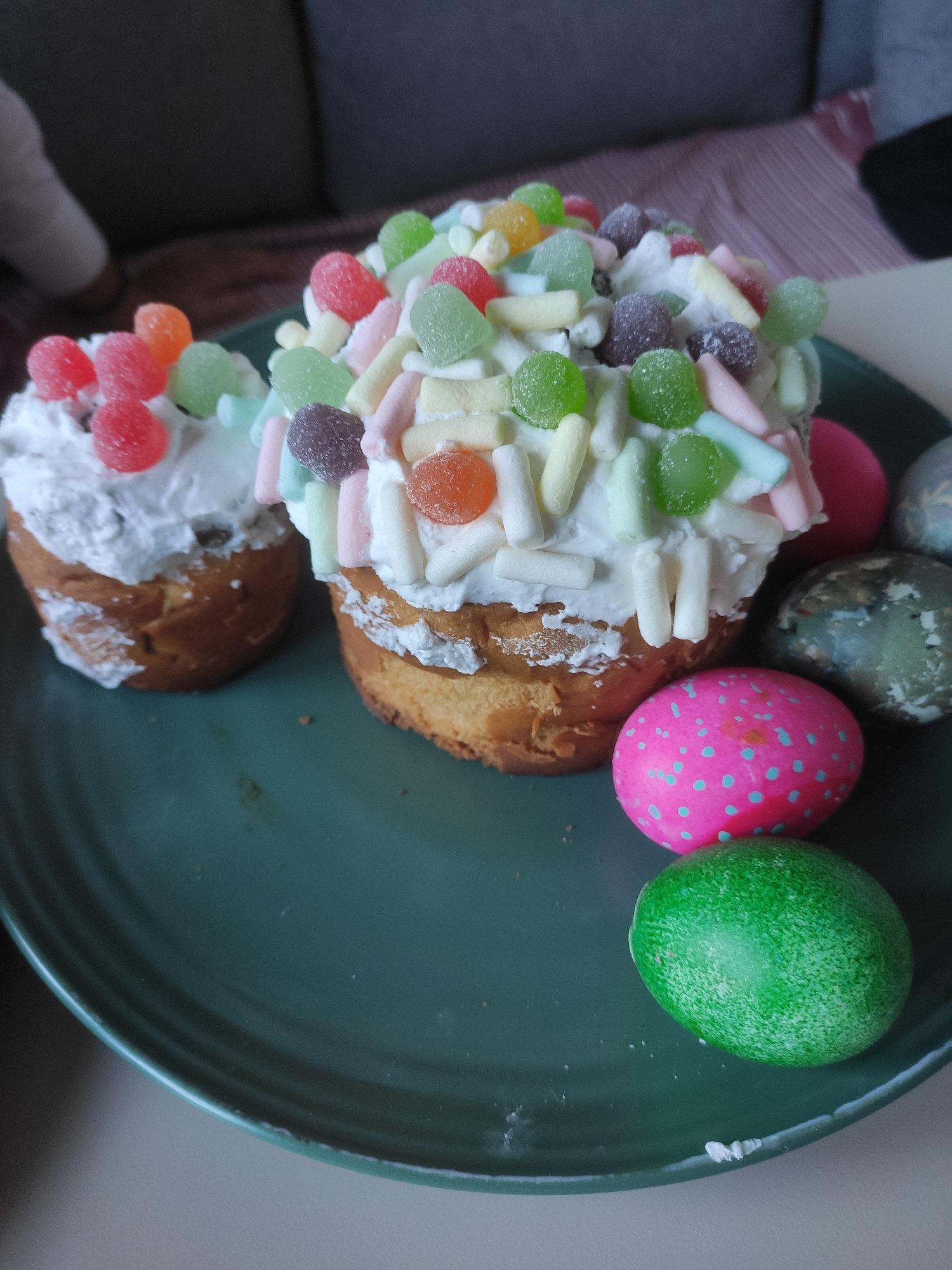 A top-down shot reveals a green plate holding two Easter cakes adorned with white icing and colorful candies, alongside a collection of dyed Easter eggs in green, pink with blue polka dots, red, and s…read more