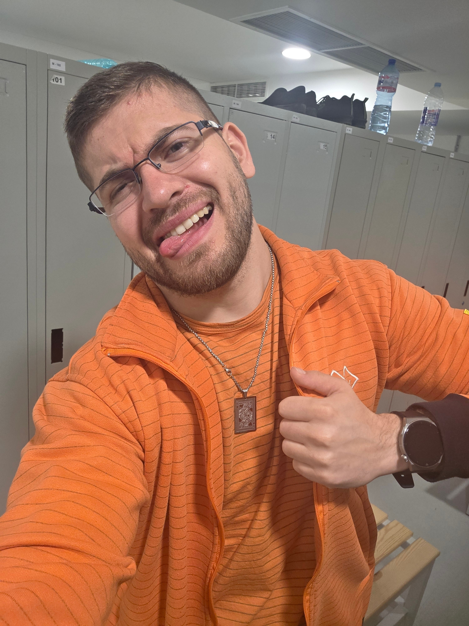 A man is taking a selfie in what appears to be a locker room. He is wearing an orange striped hooded sweater and glasses. He is sticking his tongue out and winking at the camera. He is wearing a smartβ¦read more