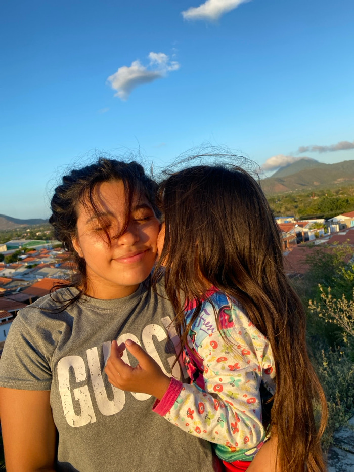 A woman with dark hair smiles with closed eyes, sun-kissed skin, and braided hair partially obscuring her face. A child wearing a floral long-sleeved shirt rests on the woman's chest. A grey "GUCCI" s…read more