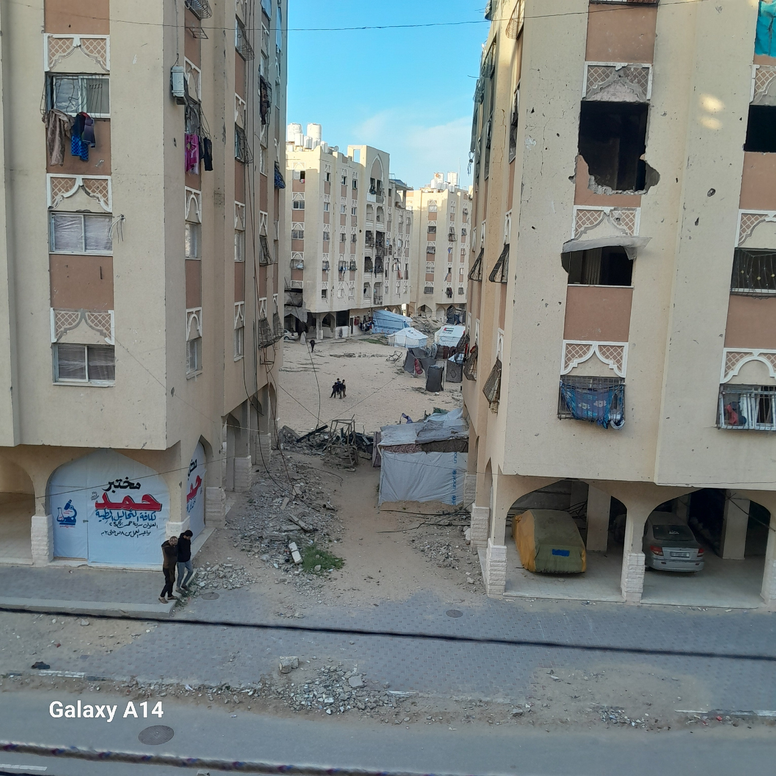 This image shows a street in what appears to be Khan Yunis, Palestinian Territory. The buildings flanking the street show evidence of damage, including a large hole in the facade of one building. Tent…read more