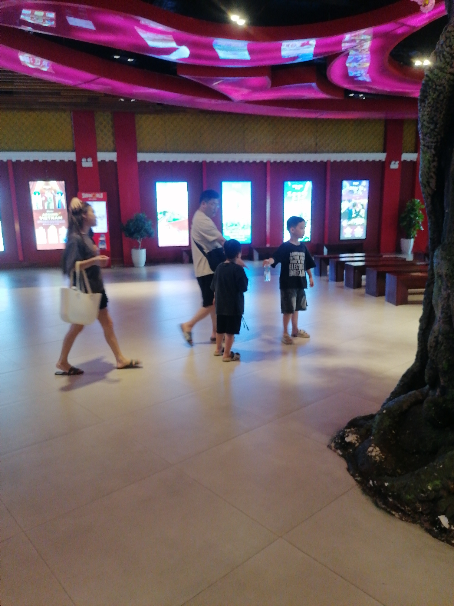 The image shows a brightly lit indoor space in Hong Gai Ward, Vietnam. Visible are tiled floors, red pillars, and decorative ceiling elements that appear to be video displays with colorful abstract co…read more