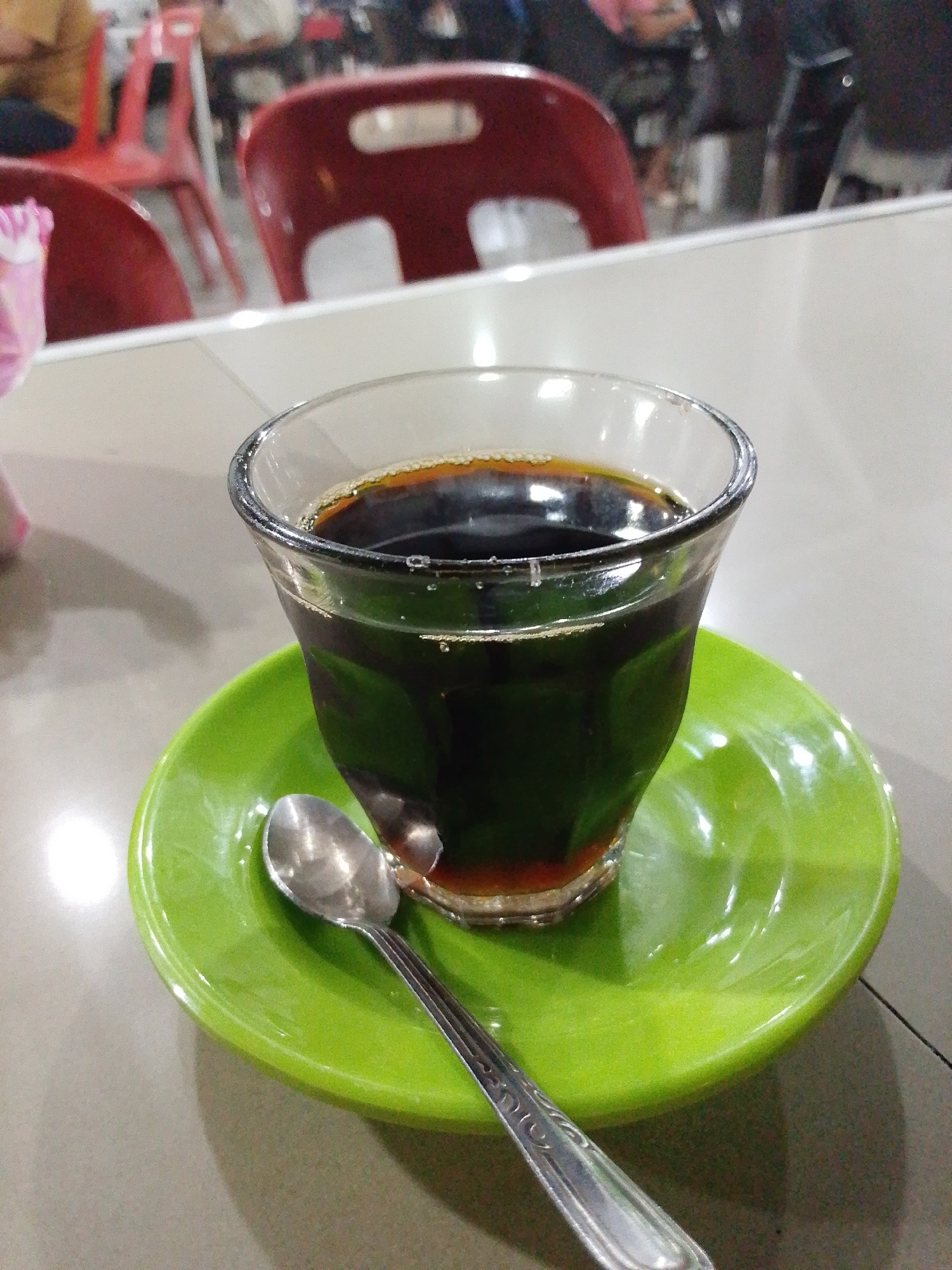 The image captures a glass of dark liquid, likely coffee, placed on a bright green saucer alongside a small silver spoon. The setting appears to be a table at a restaurant or cafe, indicated by the pr…read more