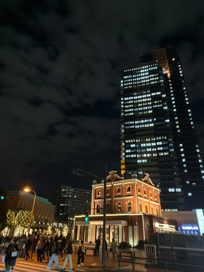 The image depicts an urban night scene at Yebisu Garden Place in Ebisu, Shibuya, Japan. A three-story, reddish-brown brick building with a white ground floor and ornate gables is centrally positioned…read more