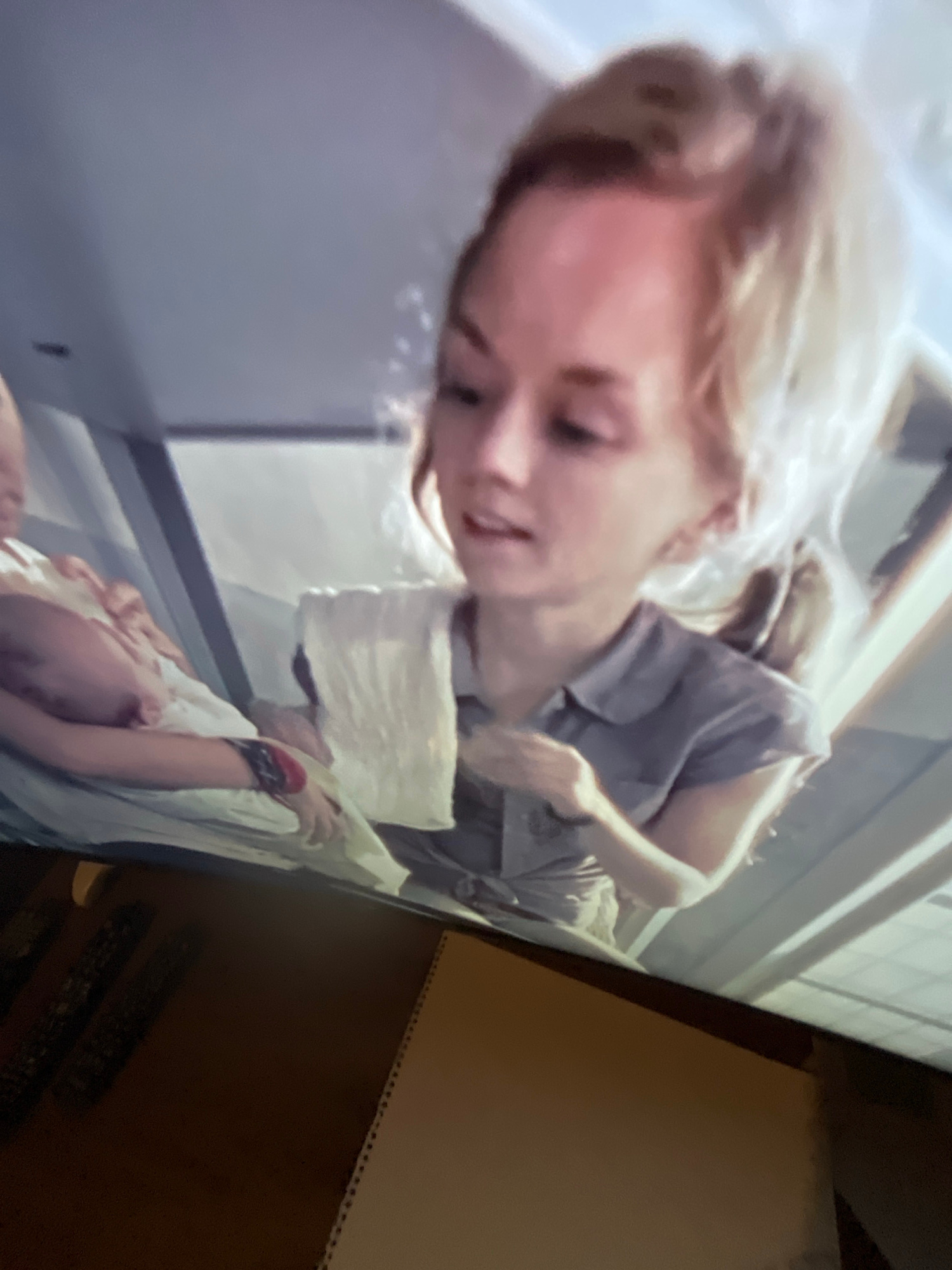 A fair-skinned woman with blonde hair, wearing a grey top, is looking down at a baby wrapped in a white blanket in what appears to be a medical setting. The scene may be from a television screen, give…read more