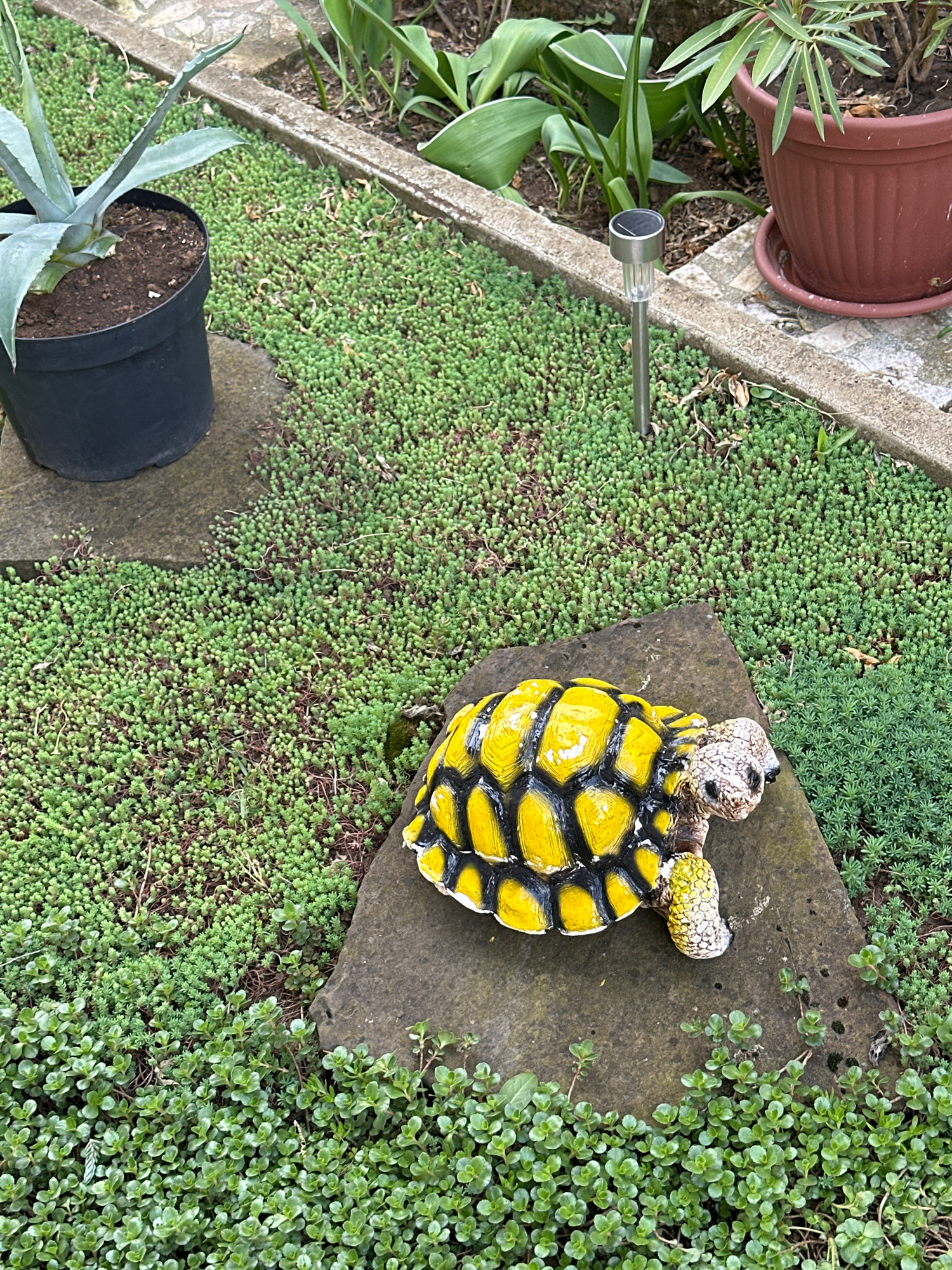 A high-angle shot depicts a garden scene, possibly in Montana, Bulgaria, though no specific landmarks confirm this. A yellow-and-black turtle figurine sits atop a flat stone slab, surrounded by low-gr…read more
