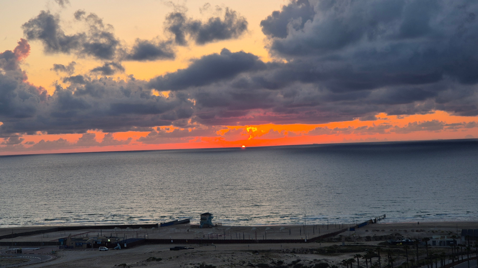 The image captures a sunset over the sea in an unknown city and country. The sky is filled with dark, gray clouds at the top, with some tinged with orange and pink from the setting sun. A narrow horizβ¦read more