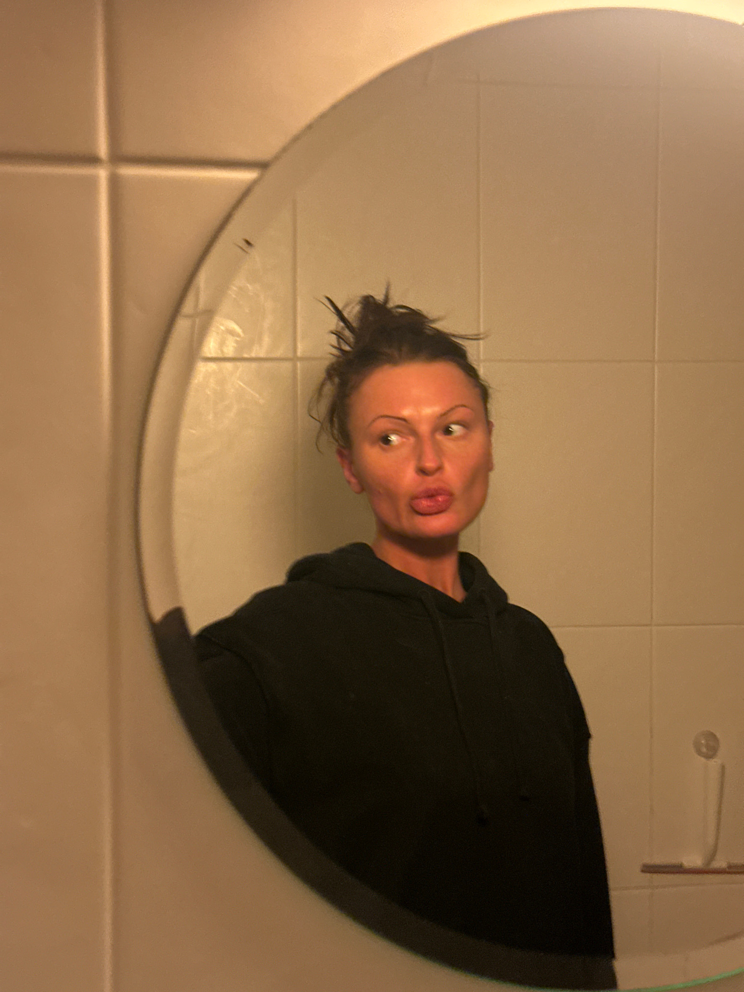 A woman with her hair up and wearing a black hoodie is reflected in a circular mirror. The background is a wall covered in beige tiles. A squeegee is visible above the mirror. The location appears to…read more