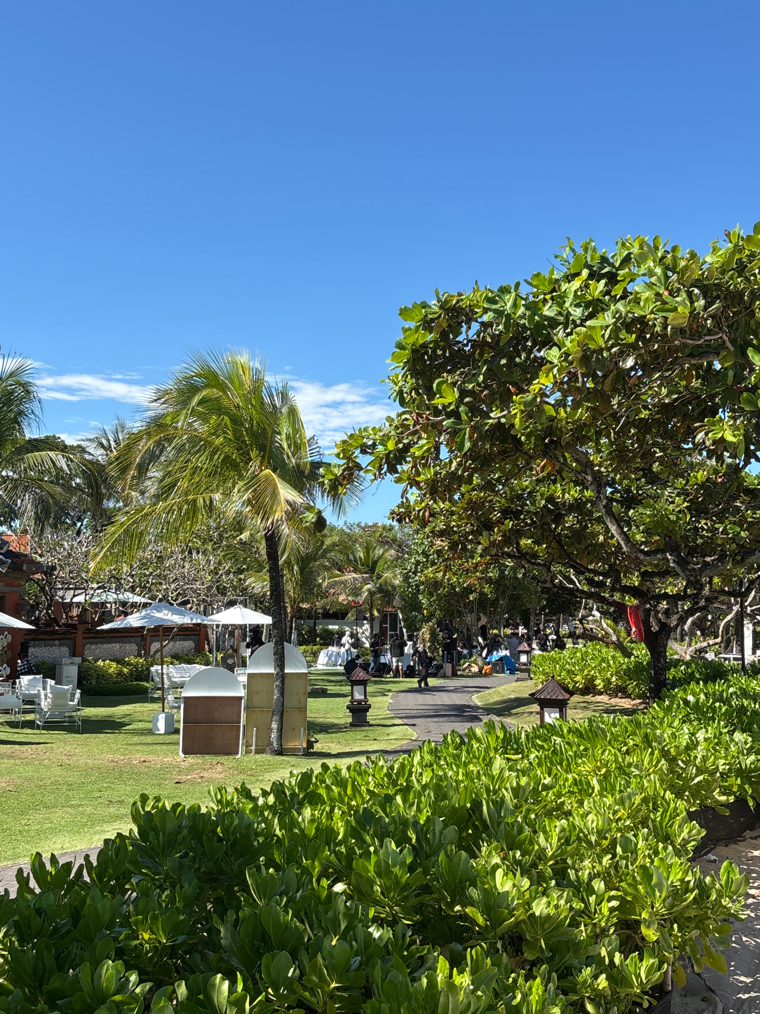 The image depicts an outdoor scene in Nusa Dua, Indonesia, characterized by a clear blue sky, lush greenery, and what appears to be a wedding or event setup. The foreground features dense bushes with…read more