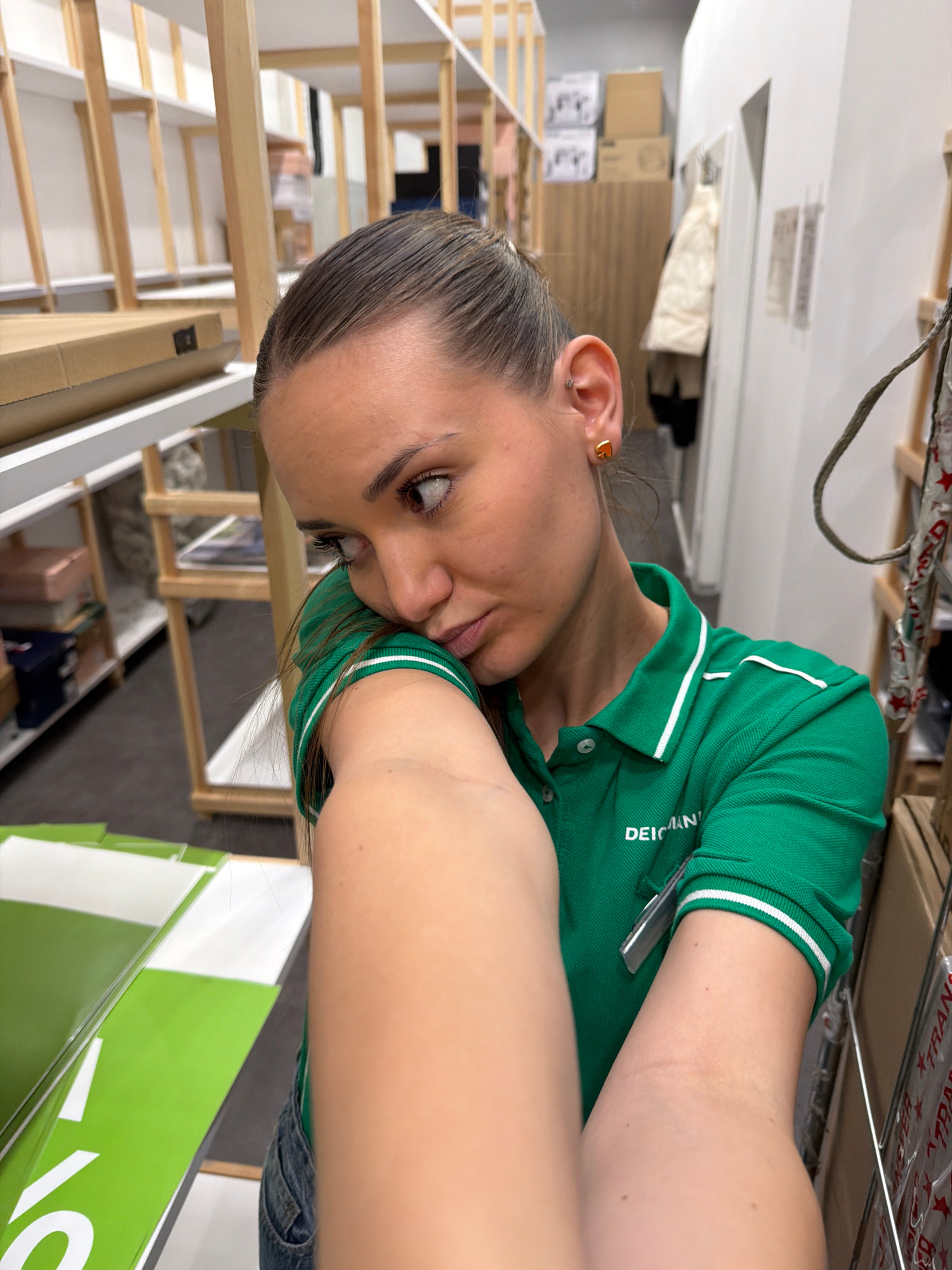 A rotated indoor eye-level selfie shows a woman with brown eyes, a light complexion, and greased-back hair. She is wearing a bright green polo shirt with white accents, and the name "DEICHMAN" is embr…read more