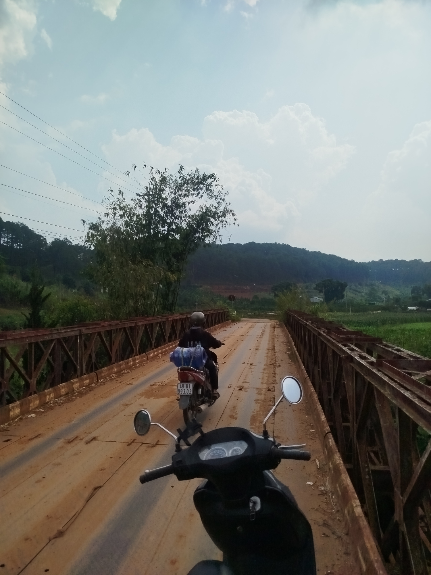 This image captures a first-person perspective from a motorcycle crossing a rusty, metal truss bridge in a rural, hilly landscape. Ahead, another motorcycle, ridden by a person wearing a helmet, navig…read more