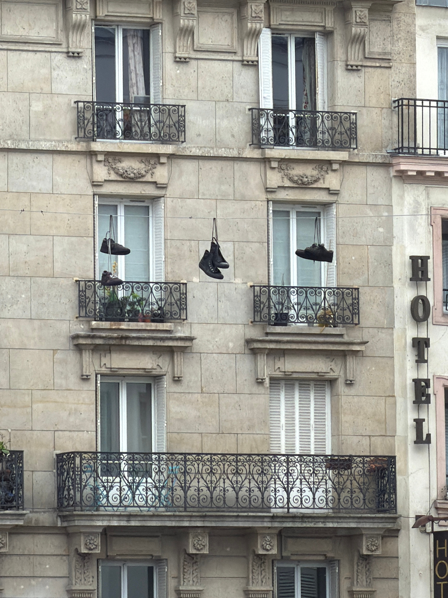 The image shows the facade of a building in Paris, France, identified by the "HOTEL" sign on the top. The building has a grey, stone-like exterior with multiple windows, some featuring decorative iron…read more