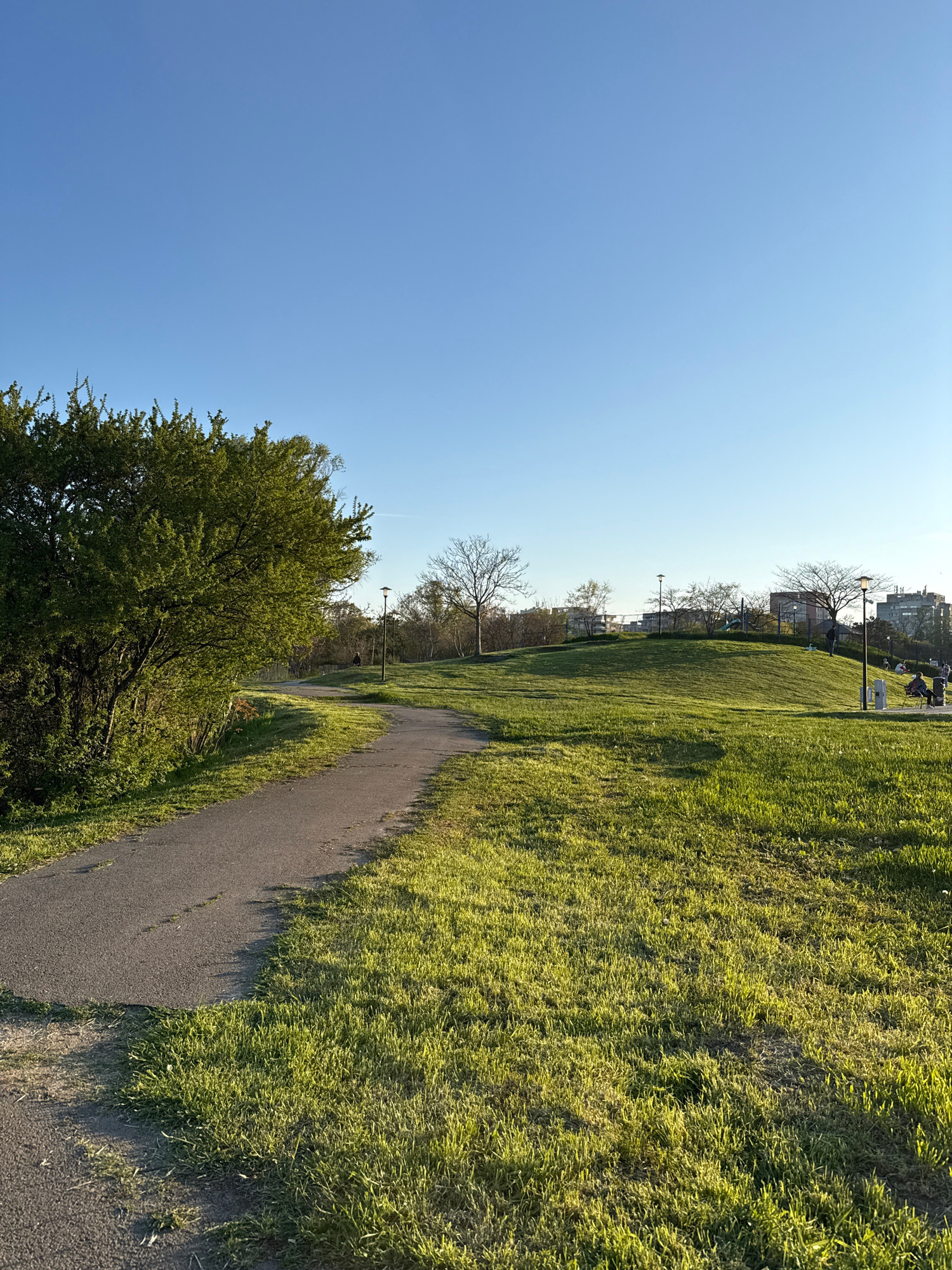 The image shows a park scene in Constanța, Romania, featuring a paved pathway winding through a grassy area under a clear blue sky. The pathway curves from the lower right to the upper-middle portion…read more