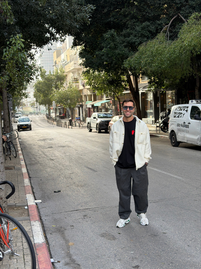 The image displays a male individual standing on an asphalt street in Tel-Aviv, Israel, under natural daylight. He is positioned centrally, facing forward, with a slight smile, wearing dark sunglasses…read more