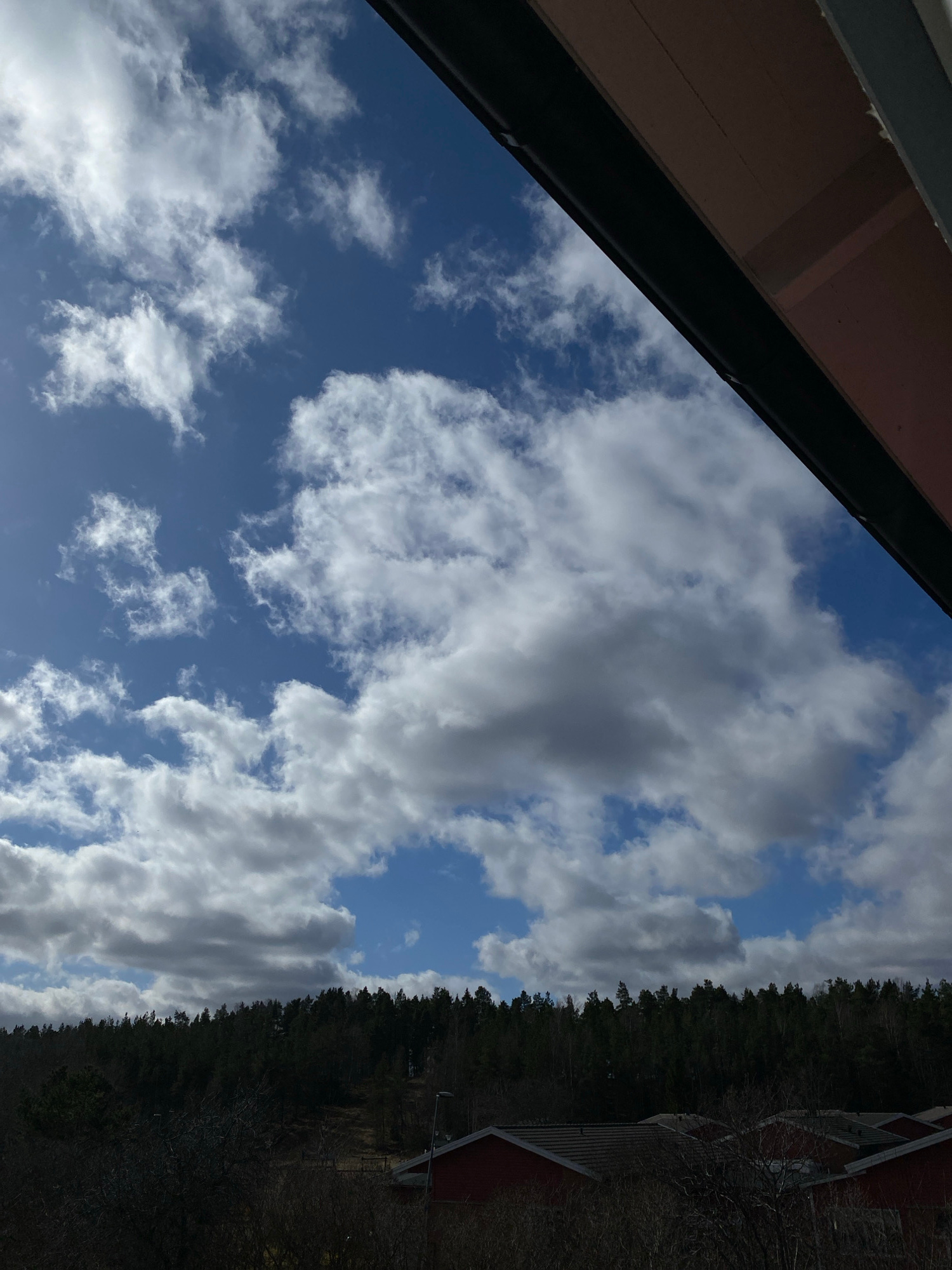 The image, taken in Björklinge, Sweden, presents an upward perspective featuring a partially visible building element in the upper left, likely a roof or eave, with a dark trim. The majority of the sc…read more