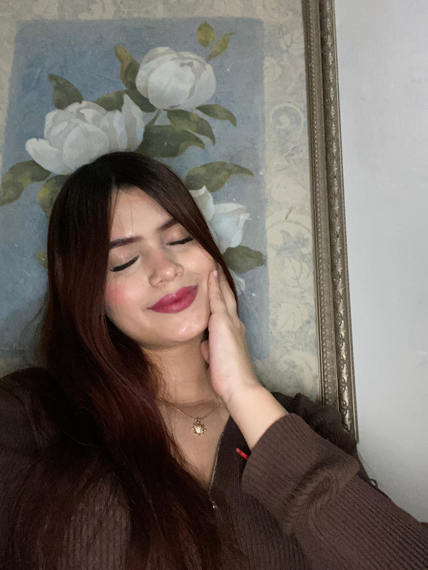 A woman lies sideways in front of a framed painting depicting a bouquet of white flowers against a pale blue background. She is wearing a brown sweater and a gold necklace. Her right hand rests on her…read more
