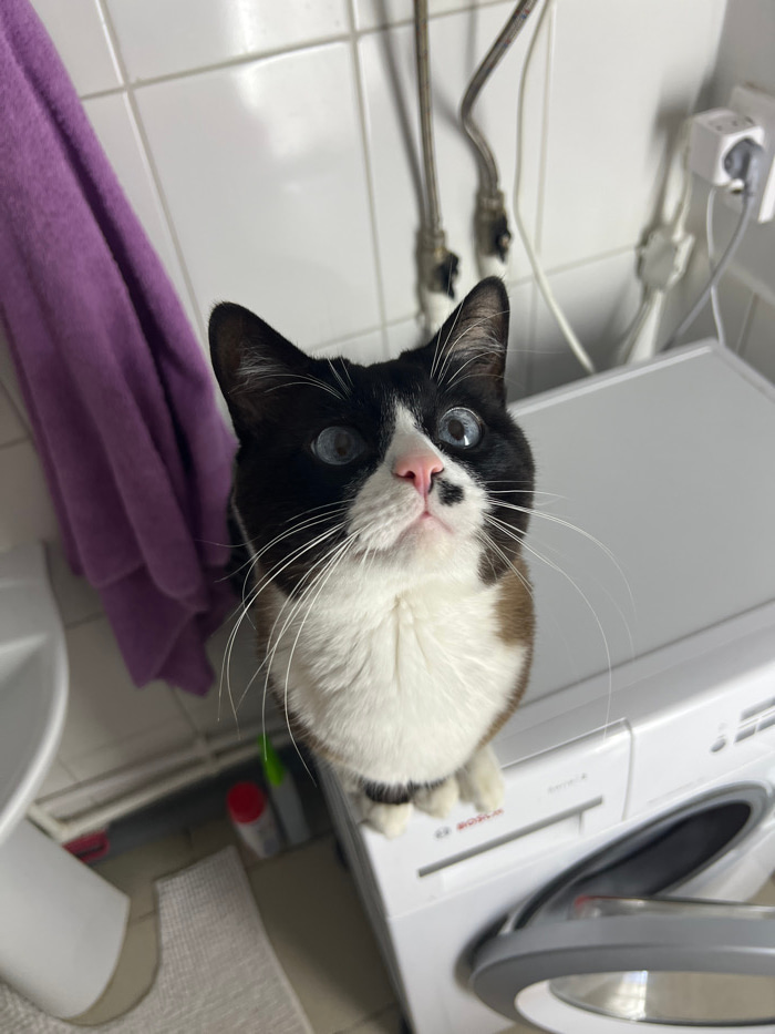 A cat with black and white fur, large blue eyes, and a pink nose peers upwards. Its body rests on a white washing machine. A purple towel lies in the lower-left corner of the shot. The background featβ¦read more