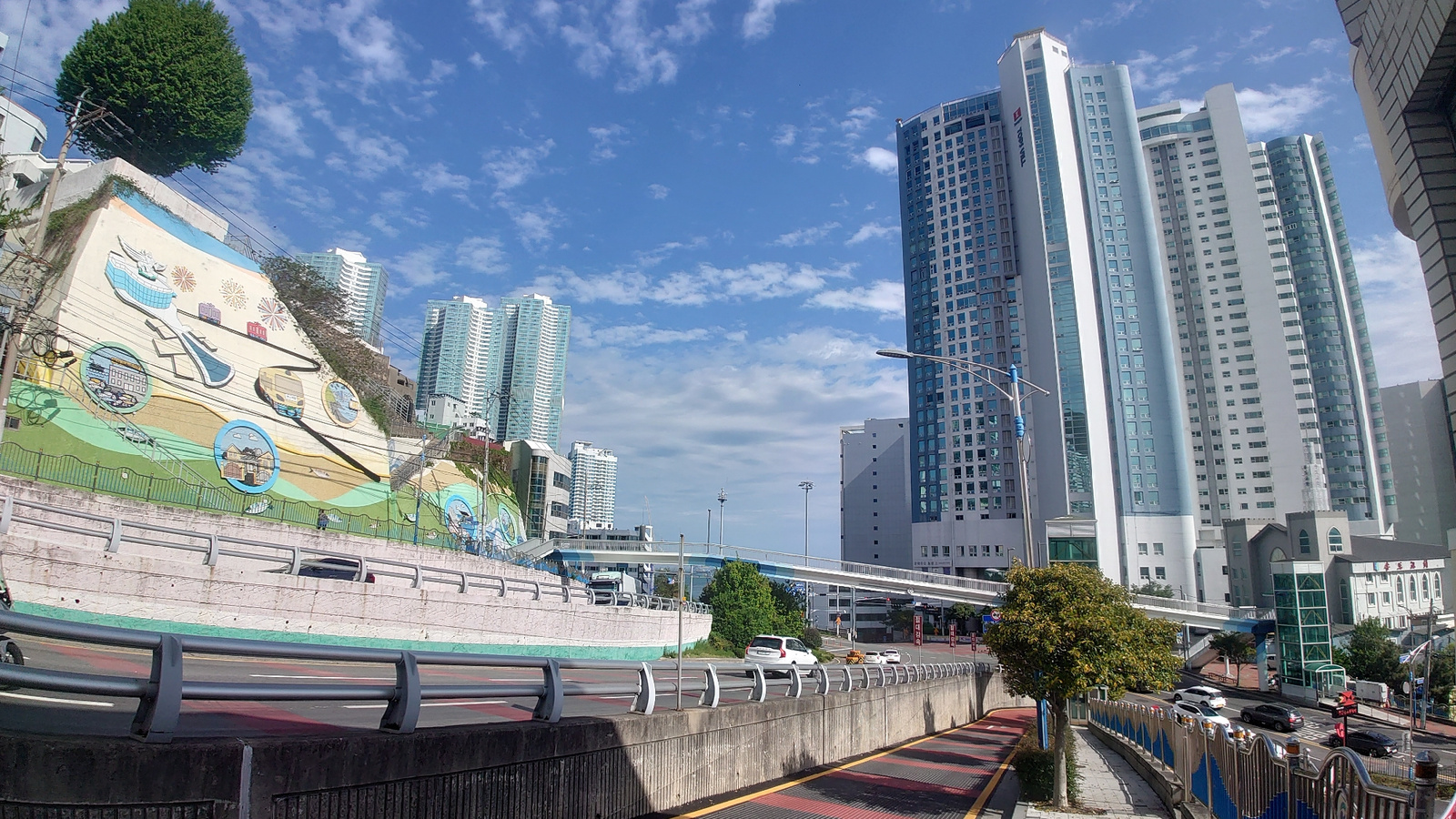 The image presents an urban scene in Busan, South Korea. In the foreground, a multi-lane road is divided by concrete barriers with metal railings. Parallel to the road is a sidewalk with red and yelloโฆread more