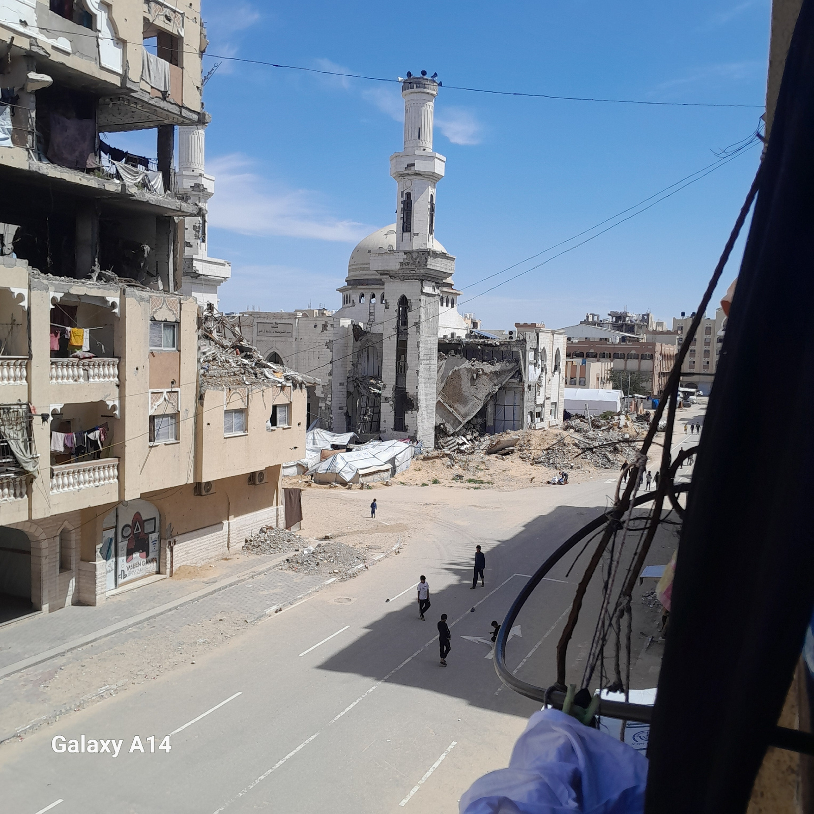 An elevated view captures a street scene in Khan Yunis, Palestinian Territory, under a clear blue sky with sparse clouds. To the left, several multi-story residential buildings are severely damaged, d…read more
