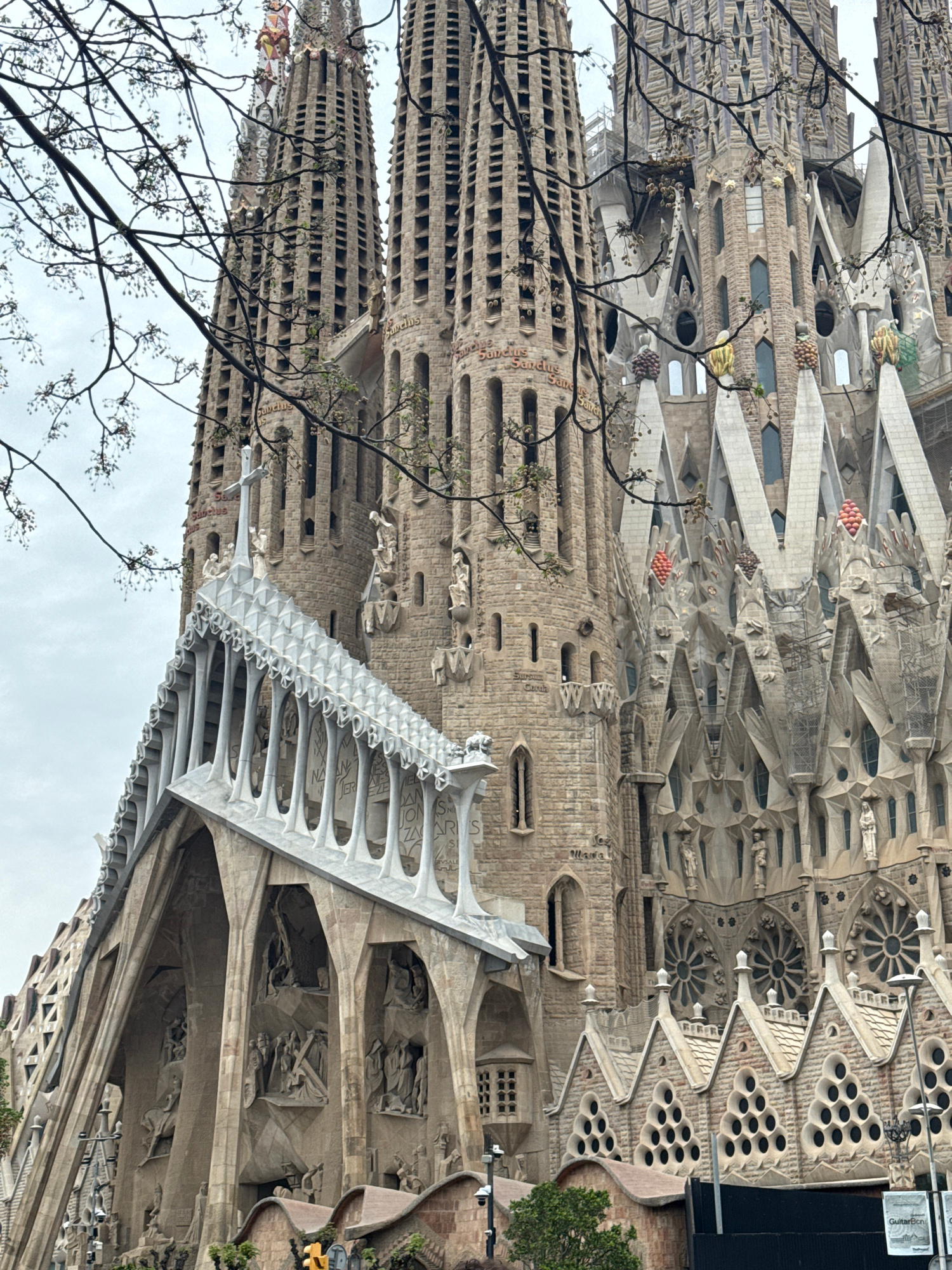 The image shows a partial view of the Sagrada Familia, a large unfinished Roman Catholic minor basilica in Barcelona, Spain. The basilica's facade is characterized by its intricate, highly ornamented…read more