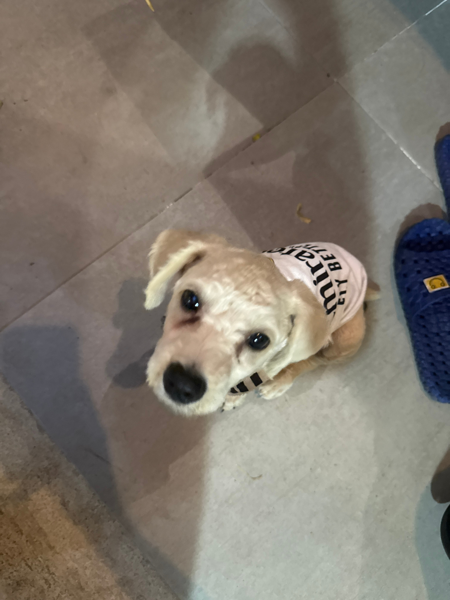 A cream-colored dog wearing a white t-shirt with black writing on it is lying on a gray tiled floor. The writing on the t-shirt appears to be “FLY BETTER”. The dog is looking up towards the camera wit…read more