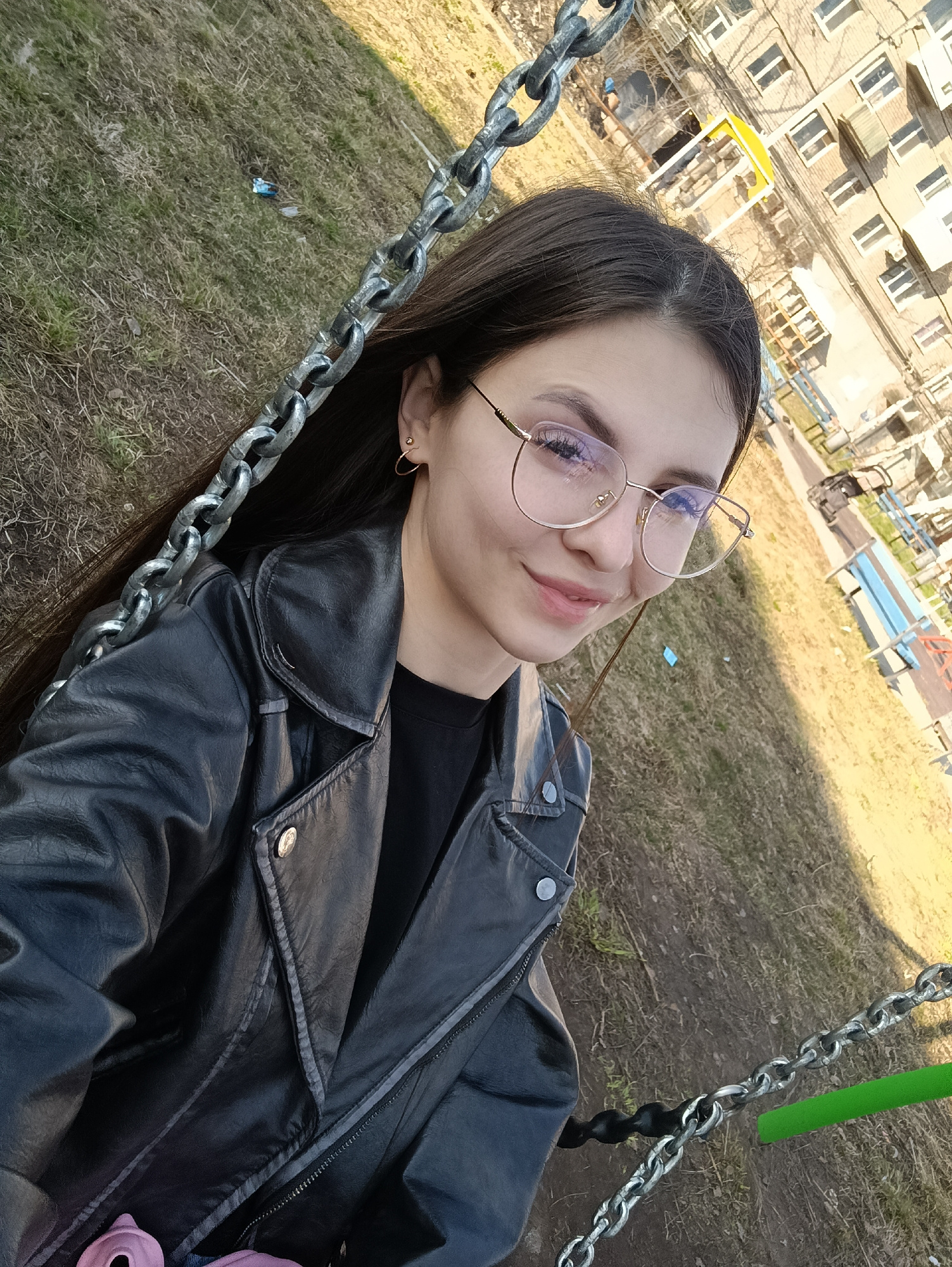 A young woman is taking a selfie while on a swing set outdoors. The background shows a multi-story apartment building with beige walls and multiple windows. The foreground is dominated by the woman, w…read more