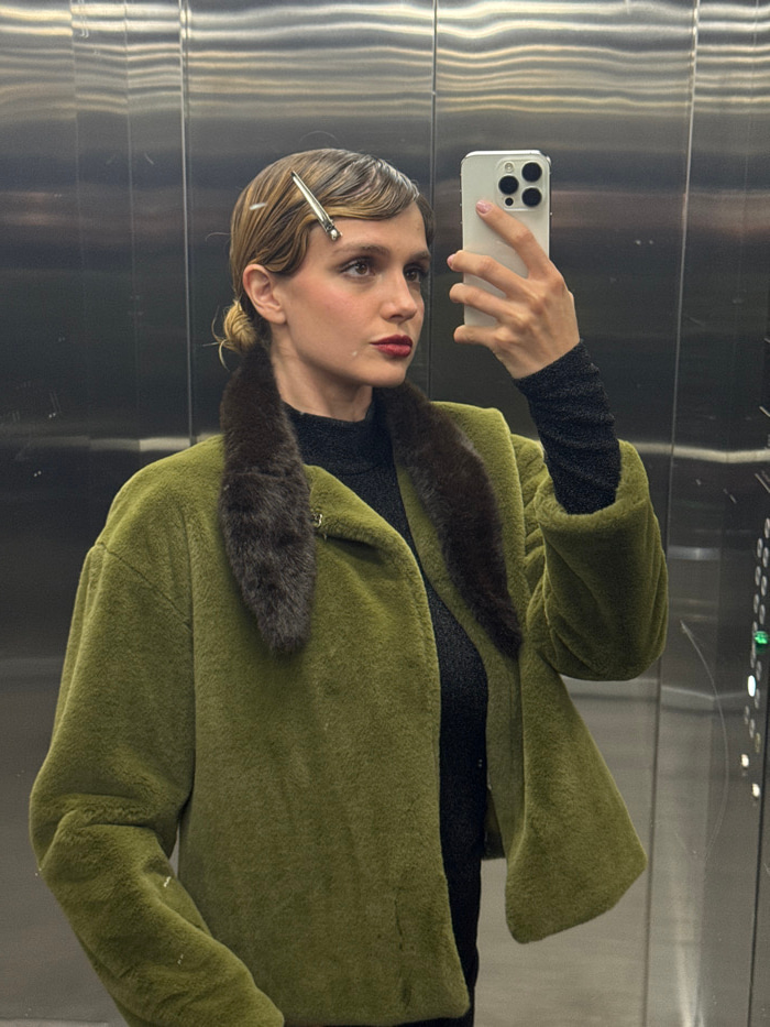 A young woman takes a selfie in an elevator. She wears an olive green faux fur coat with a dark brown fur collar, and a black top with sparkly sleeves. Her blonde hair is styled in waves with a silver…read more
