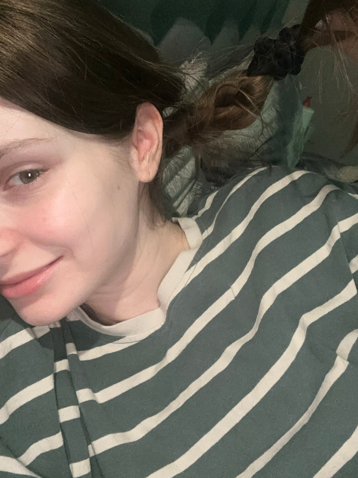 A person lies down in a striped shirt. Their hair is brunette, with a scrunchie holding some of it up. One ear is visible. The person has fair skin, a slight smile, and light eye color. The bedding or…read more