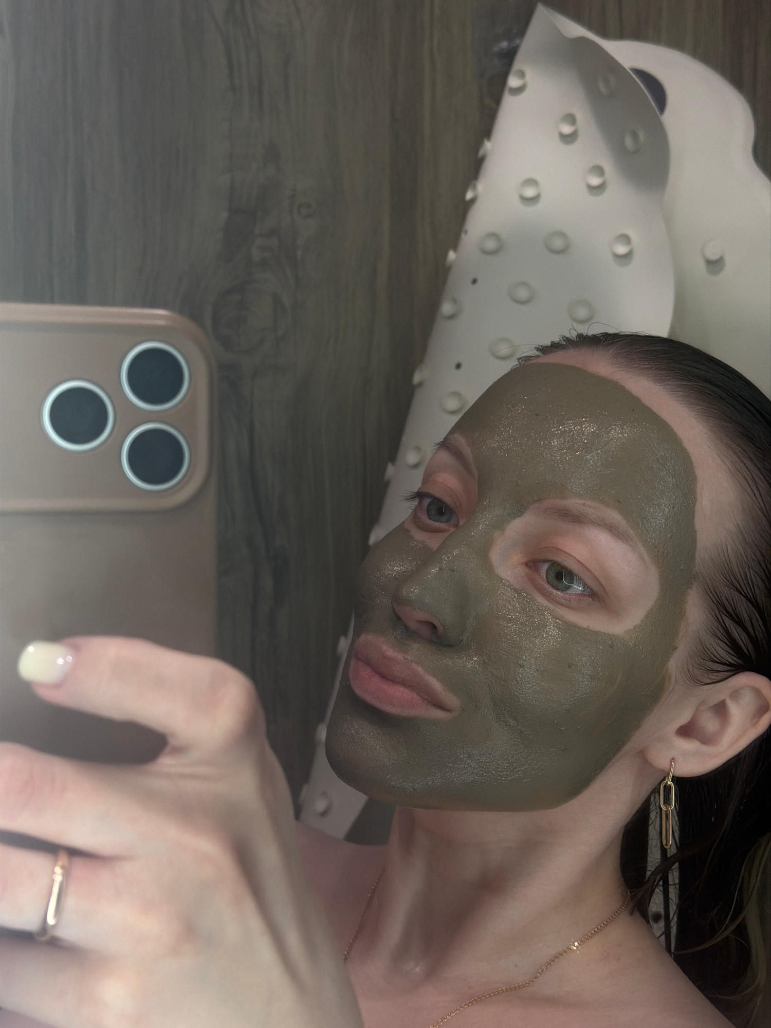 A woman with a greyish-green facial mask is lying down, taking a selfie with a gold-colored smartphone. She is on a white, textured surface that resembles a bath pillow. Her hair is wet and slicked ba…read more