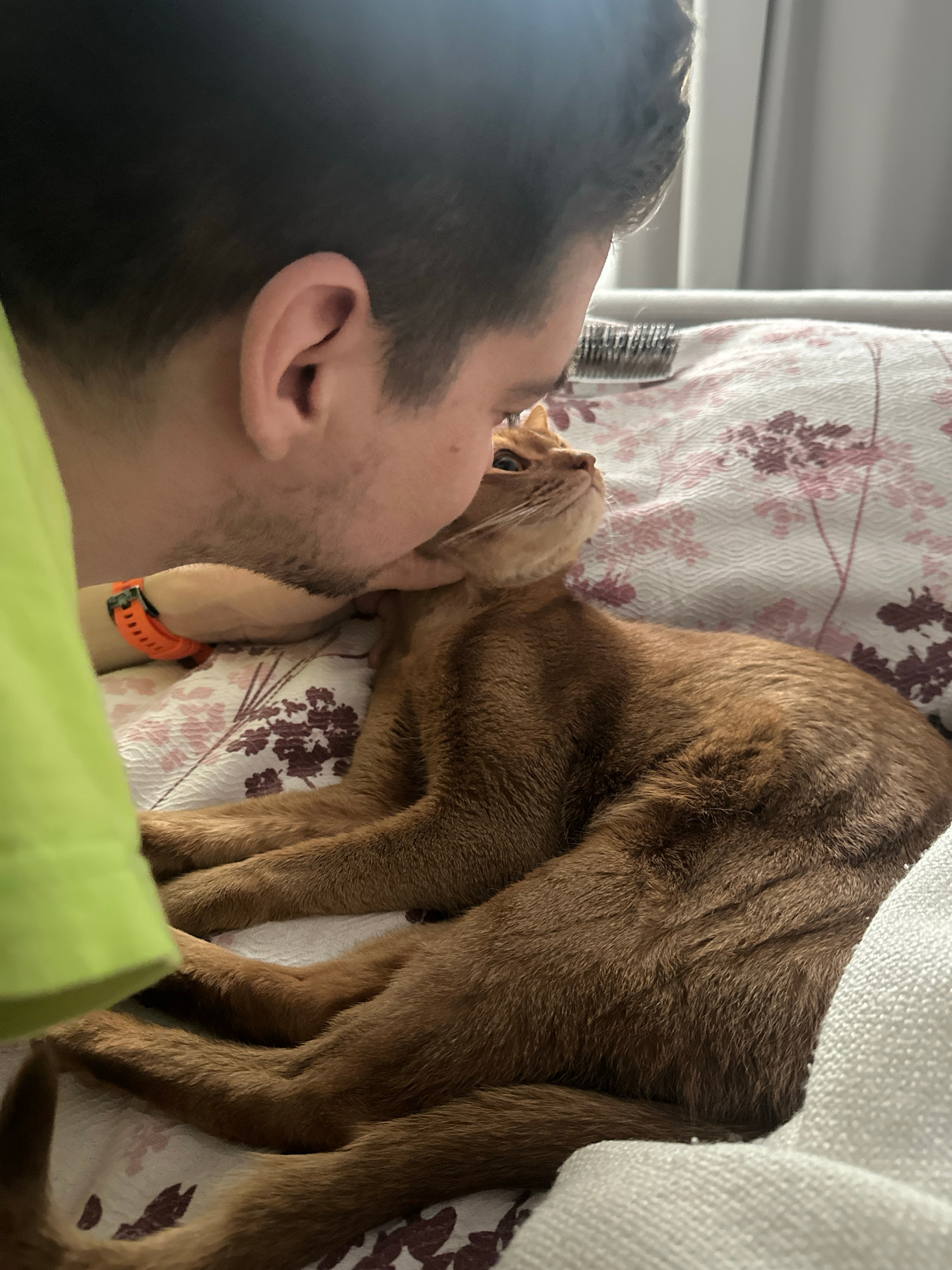A medium-range shot depicts a man in a green shirt lying on a floral-patterned fabric, face to face with a brown cat with amber eyes. The cat, positioned over the man, is oriented towards him, possibl…read more