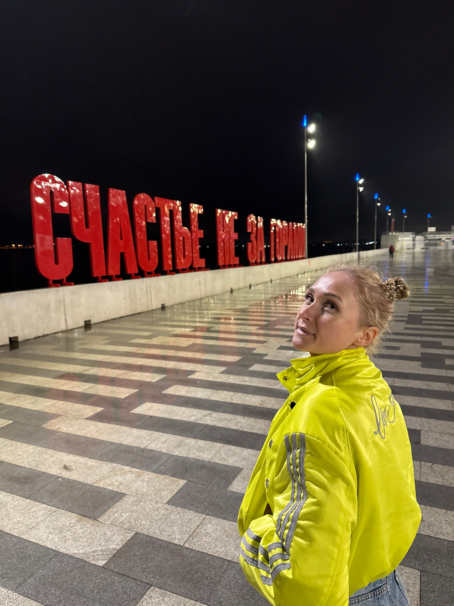 A vibrant nighttime outdoor photograph captures a woman posing next to a prominent red art installation in Perm, Russia. The woman, with light hair styled in a bun, is dressed in a bright neon yellow…read more