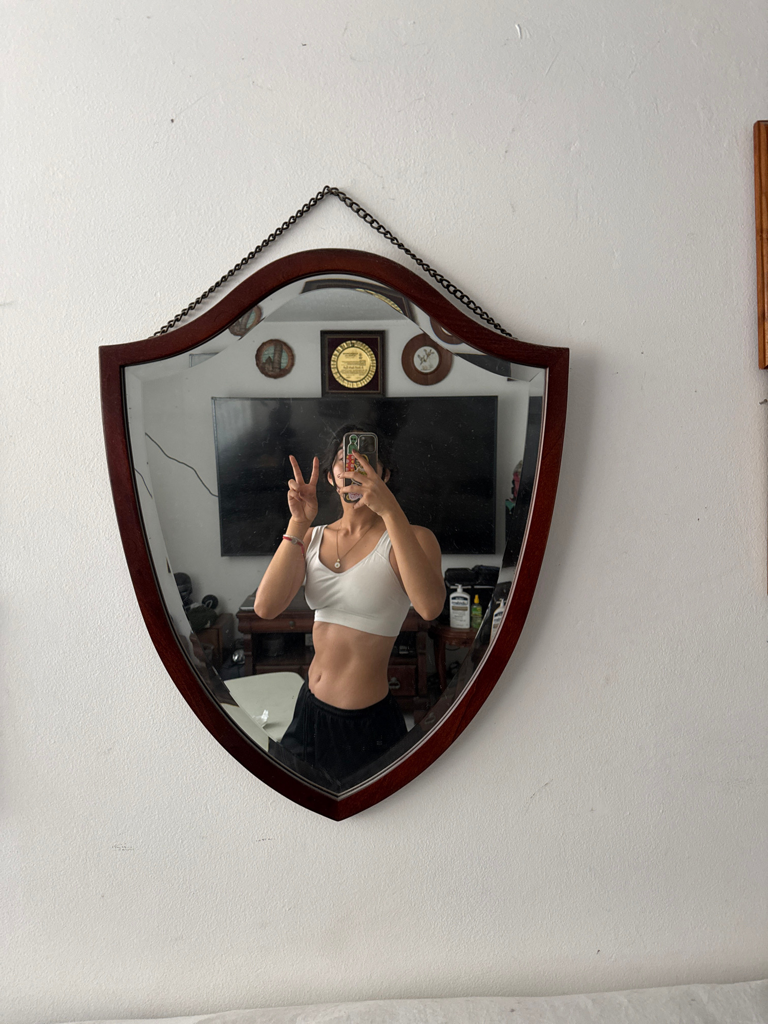 A mirror hangs on a white wall. The mirror is shaped like a leaf or a teardrop and is suspended by a chain. The frame is made of wood. The reflection in the mirror shows a person holding a cell phone…read more