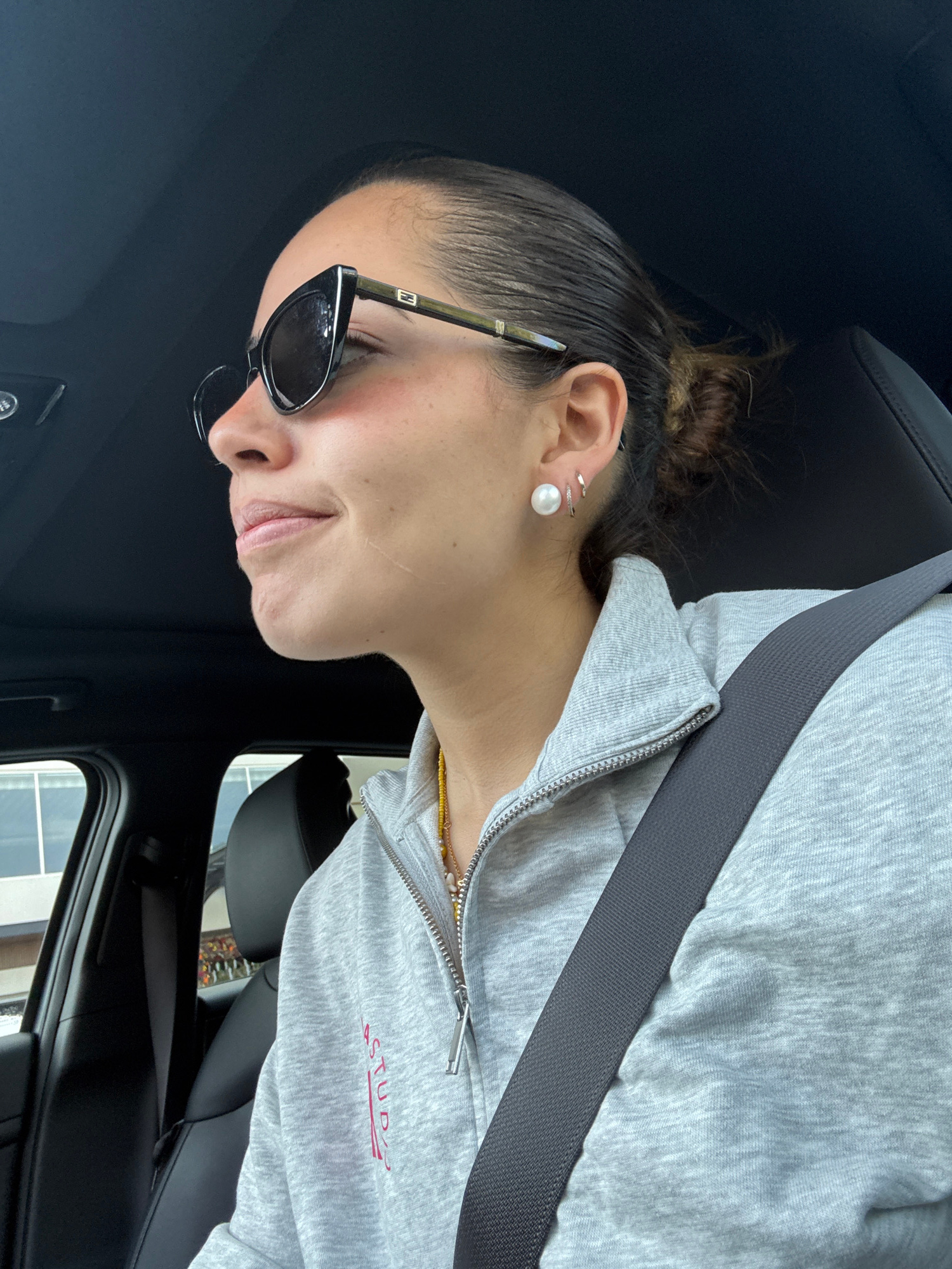 A woman wearing sunglasses, a gray zip-up hoodie with a "STUDIO" graphic, and a pearl earring is seated in a car. She has her seatbelt on and her hair is pulled back in a bun. The car appears to be pa…read more
