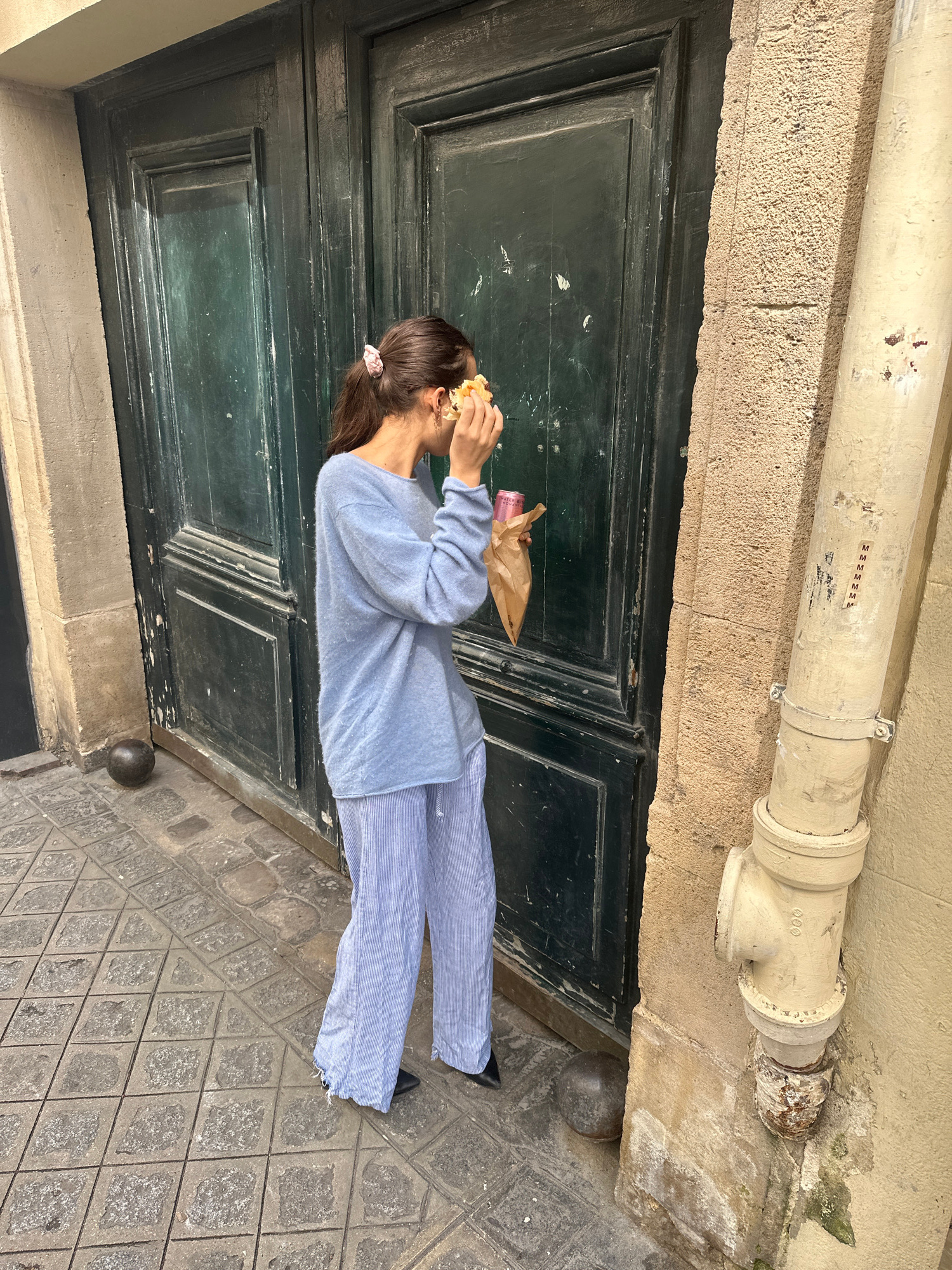 The image shows a person standing in front of a weathered, dark green, double door. The person, appearing to be female with brown hair tied back with a pink scrunchie, is wearing a light blue top and…read more