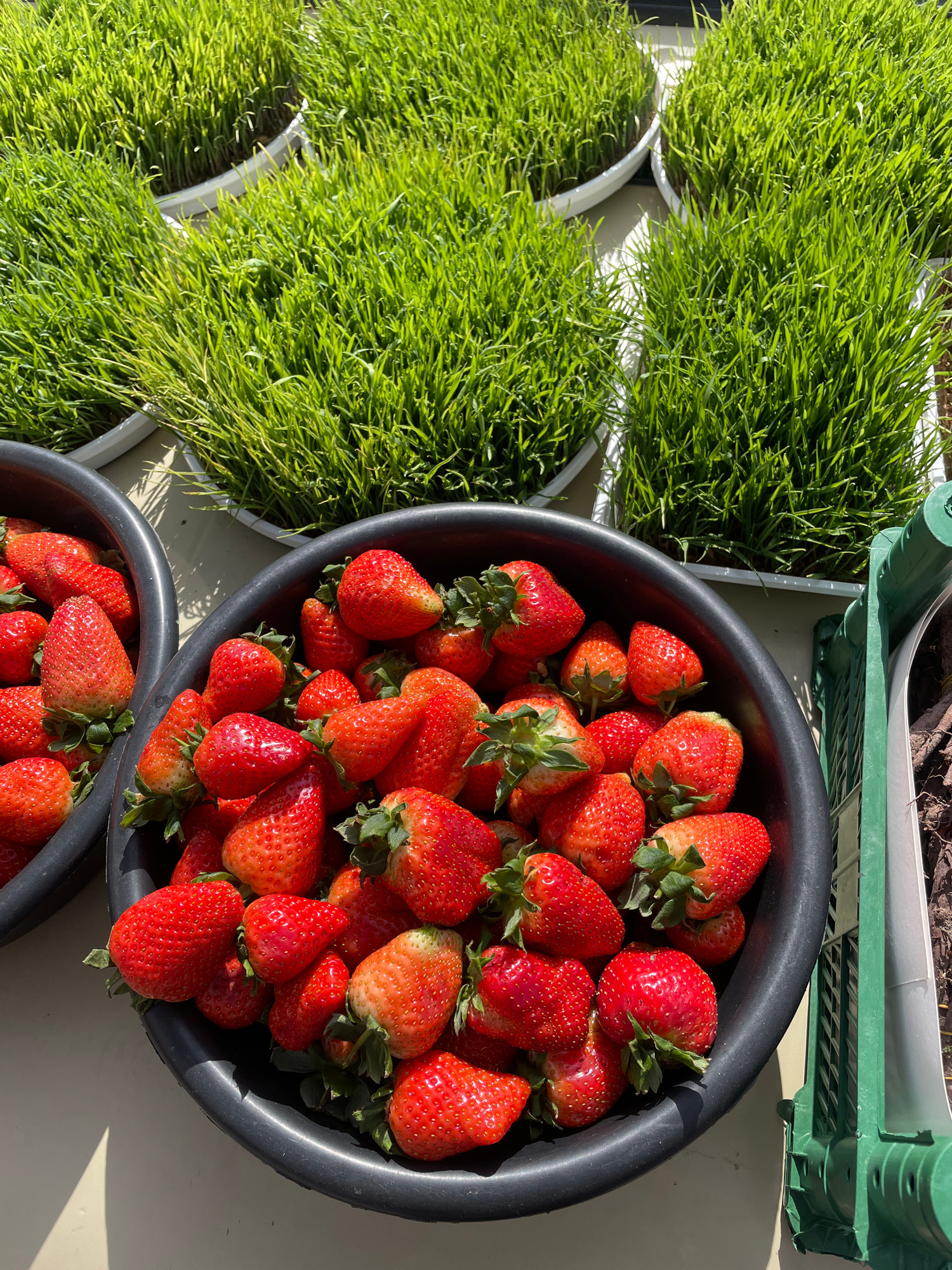 A high-angle shot shows a large black bowl filled with red strawberries. To the left, green grass-like plants are visible in white pots. In the top right corner, a green crate sits. The scene is set o…read more