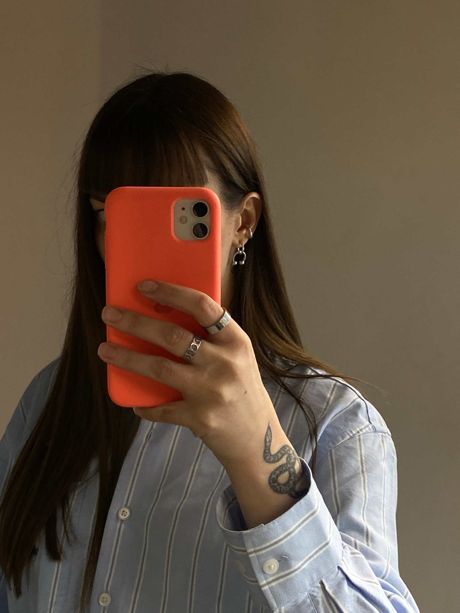 This close-up image, rotated 90 degrees counter-clockwise, captures a mirror selfie of a person holding a bright coral-orange smartphone with a dual or triple camera lens setup on the back. The person…read more