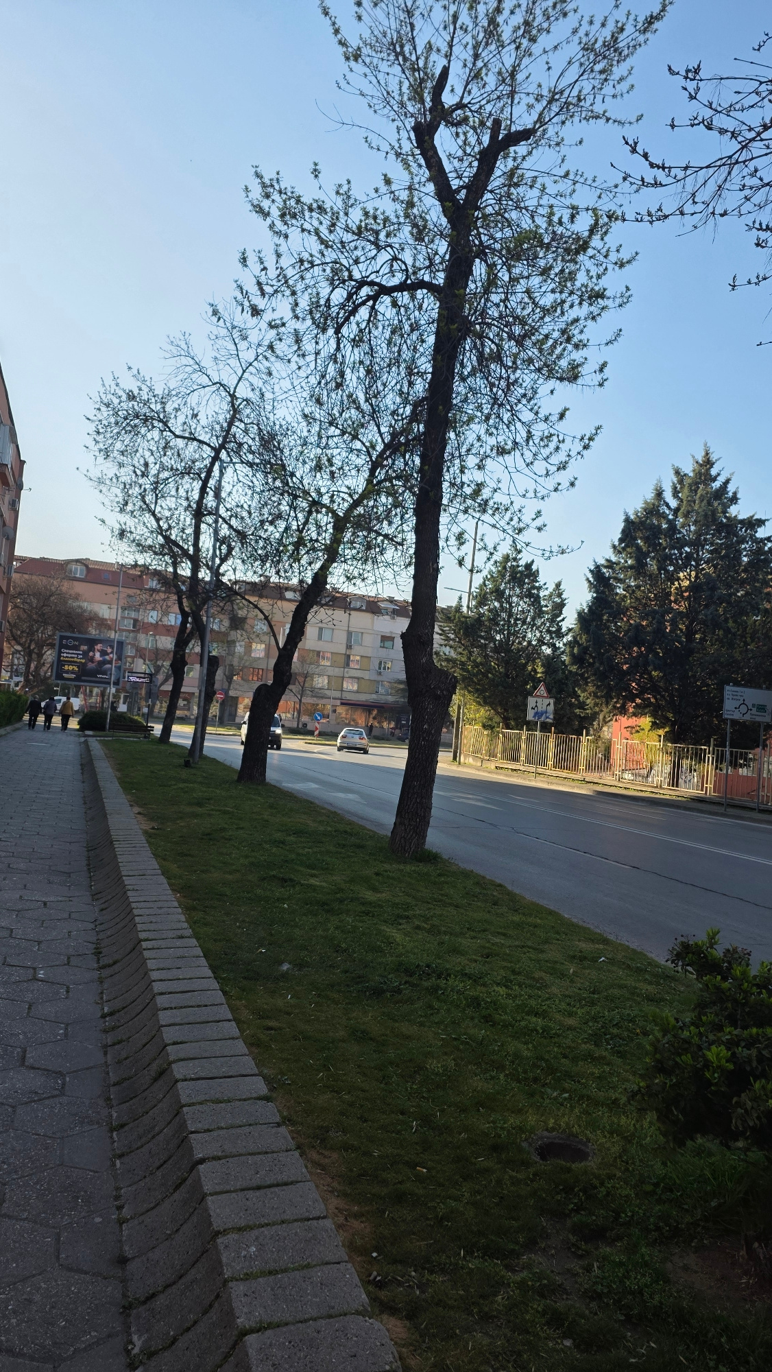 The image depicts a street scene in Blagoevgrad, Bulgaria. A sidewalk constructed of grey paving stones runs along the bottom of the frame. A low, rectangular wall separates the sidewalk from a gras…read more