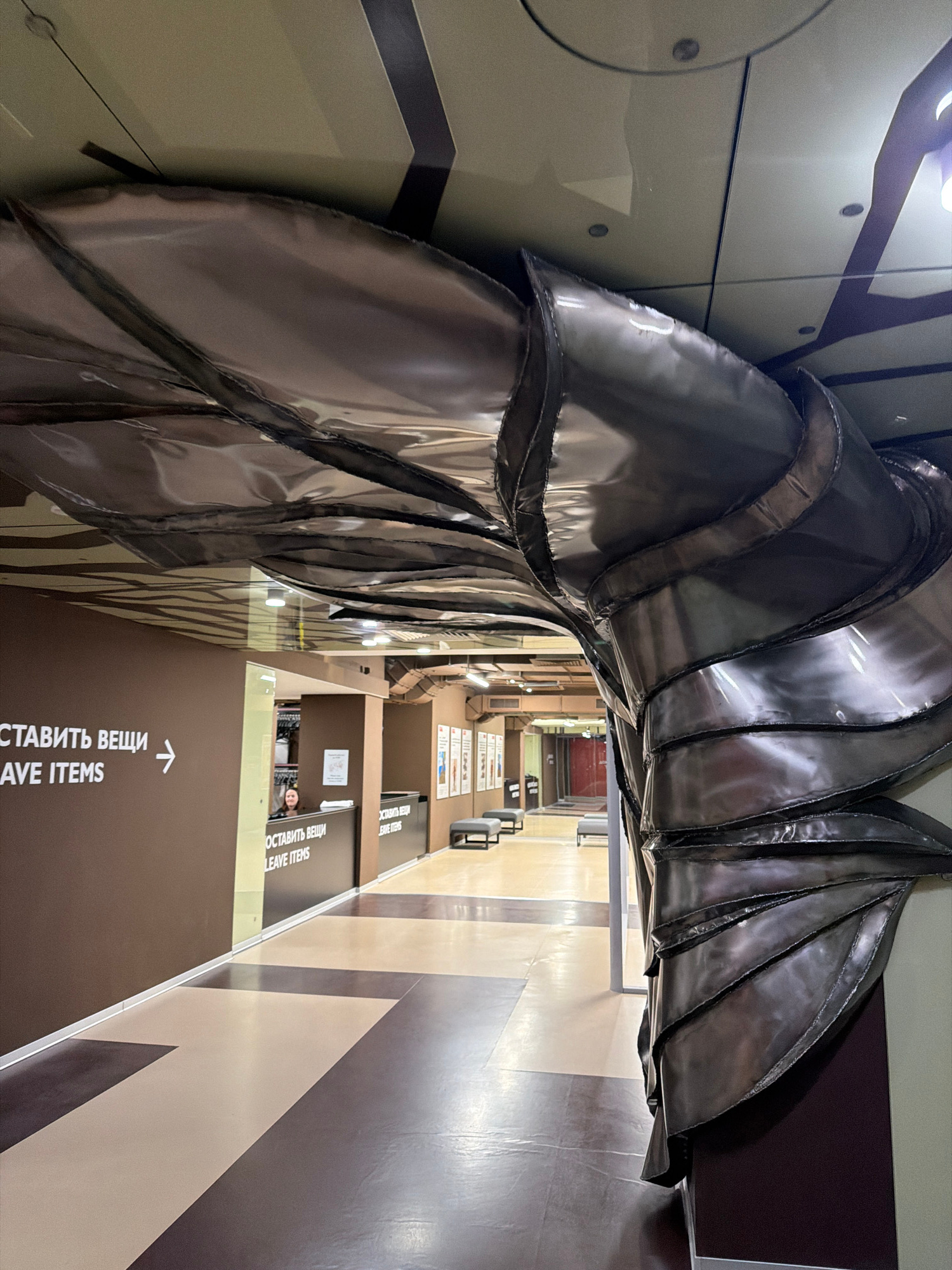 The image shows an interior view of a building in Saint Petersburg, Russia. The focal point is a sculptural installation made of overlapping, shiny, metallic elements resembling scales or leaves. The…read more