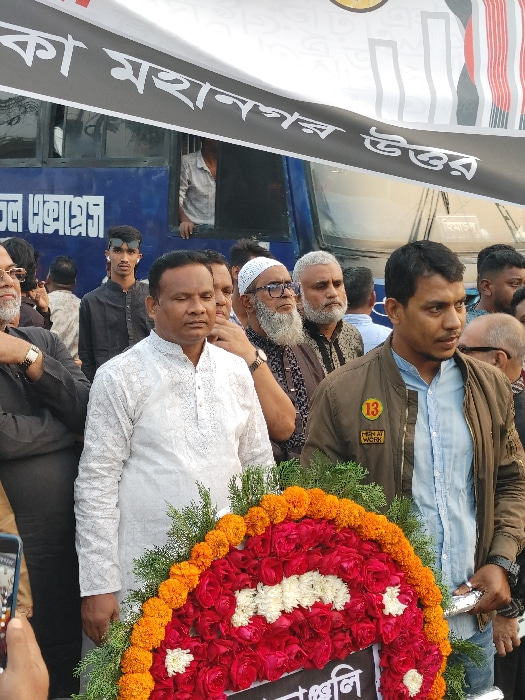 The image displays a daytime outdoor gathering of approximately a dozen men in Dhaka, Bangladesh, specifically within the Dhaka Metropolitan North area, as indicated by a prominent banner. In the imme…read more