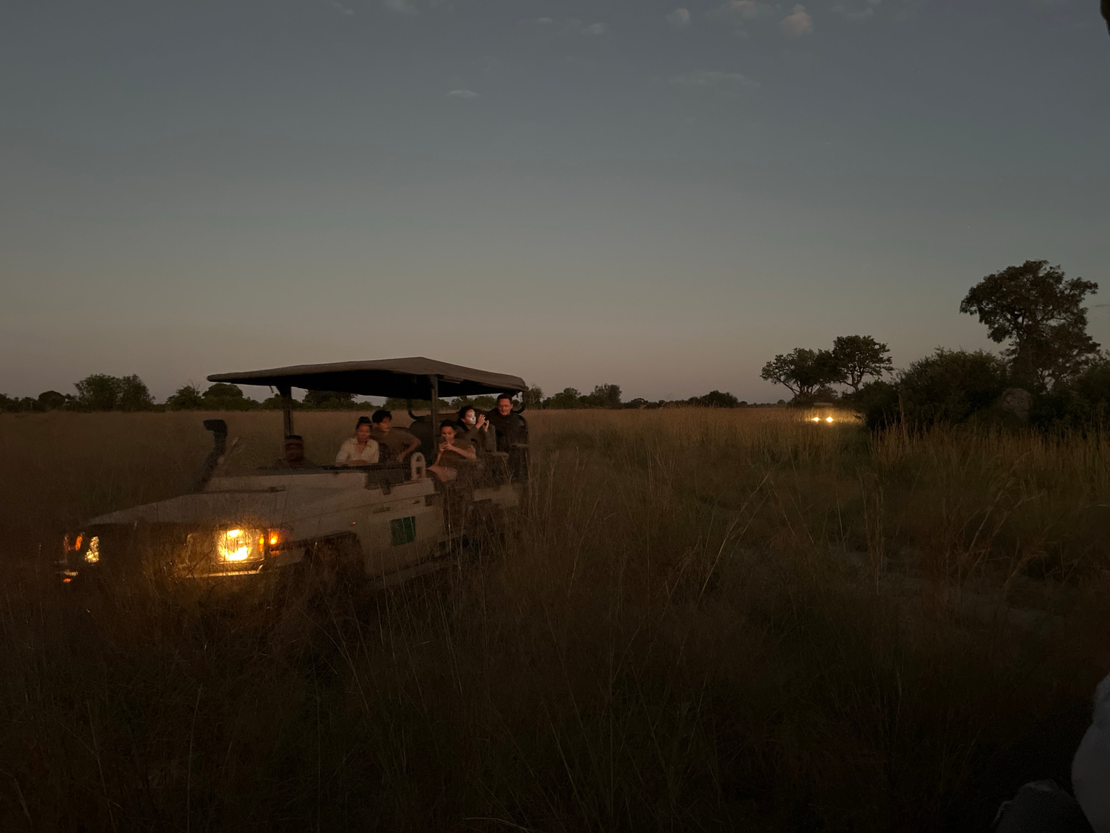 A safari vehicle containing six people is in a field of tall grass at twilight. The vehicle's headlights are illuminated. In the background, another vehicle with lit headlights is visible. The locatio…read more