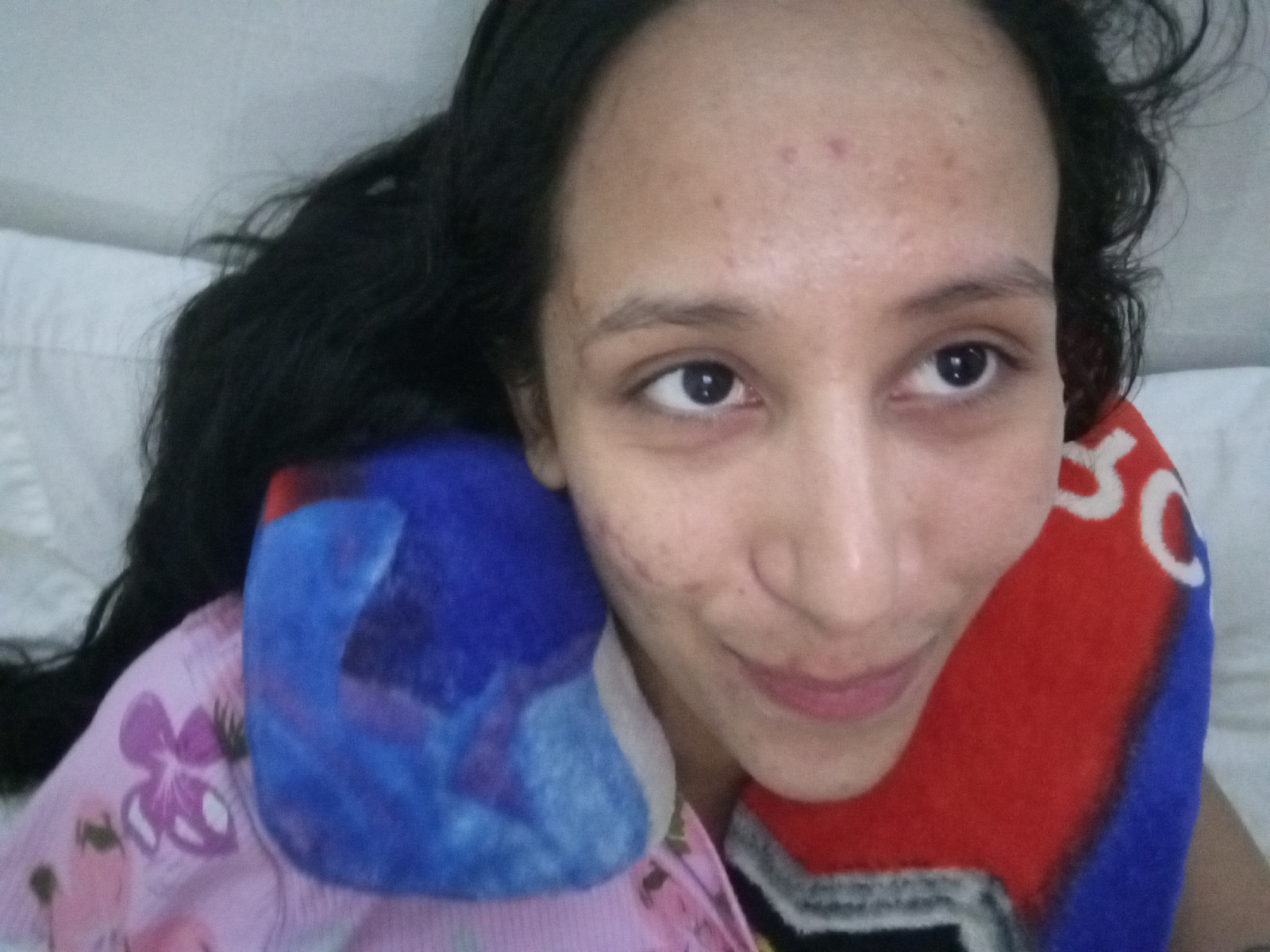 A woman is lying in bed with her head resting on a red, white, and blue pillow. She has long, dark hair and is looking to the right of the frame with a slight smile. She is wearing a pink and white sh…read more
