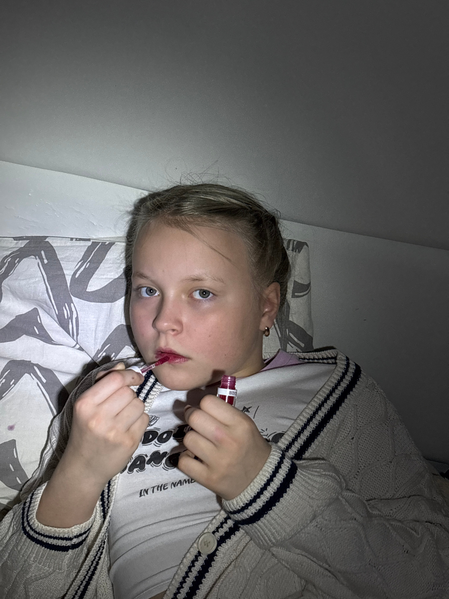 A young, light-skinned female is lying on a bed with a gray-and-white patterned comforter. She is applying red lip gloss to her lips. She is wearing a white t-shirt under a cream-colored sweater with…read more