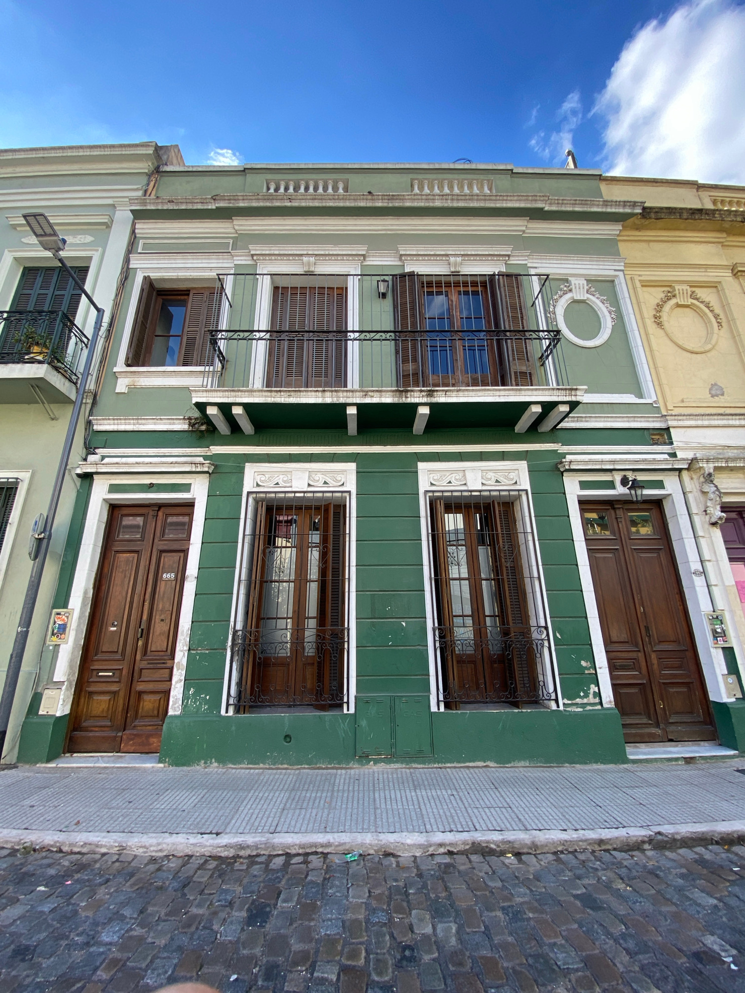 The image shows a building facade in Buenos Aires, Argentina. The building has a light green and white color scheme with dark brown wooden doors and windows. There are wrought iron window bars on someβ¦read more